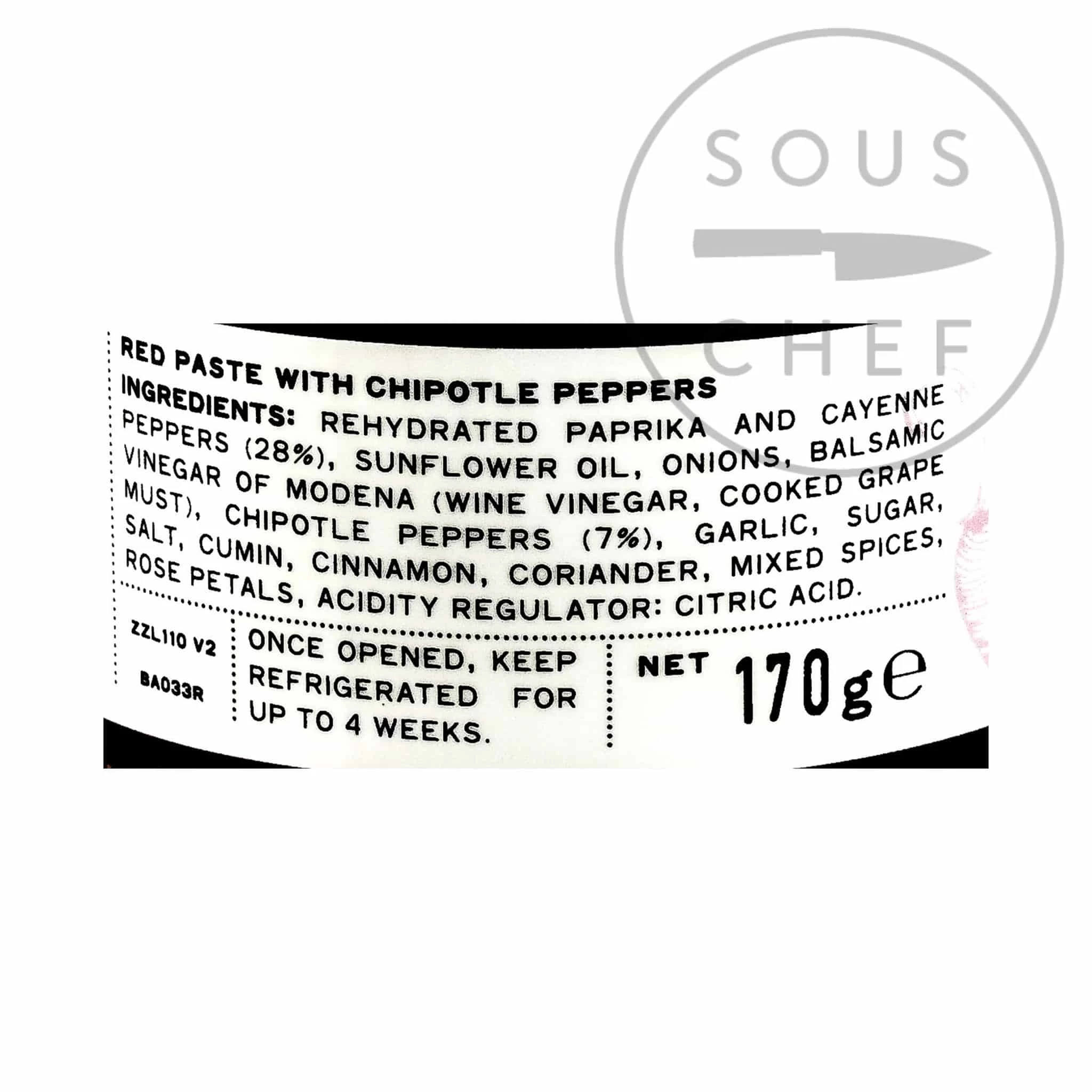 Ingredients: Rose Harissa Paste (Rehydrated Paprika Peppers, Sunflower Oil, Garlic, Salt, Mixed Spices, Rose Petals), Fried Diced Onion (Onions, Sunflower Oil), Sunflower Oil, Balsamic Vinegar of Modena (Cooked Grape Must, Wine Vinegar) contains sulphites <10ppm, Chipotle Pepper Flakes (7%), Harissa Dry Spice Mix (Paprika, Garlic, Cayenne Pepper, Cumin, Sunflower Oil), Dark Muscovado Sugar, Water, Paprika Flakes, Sweet Smoked Paprika, Salt, Cinnamon Powder, Coriander Powder, Garlic Puree, Acidity Regulator: Citric Acid