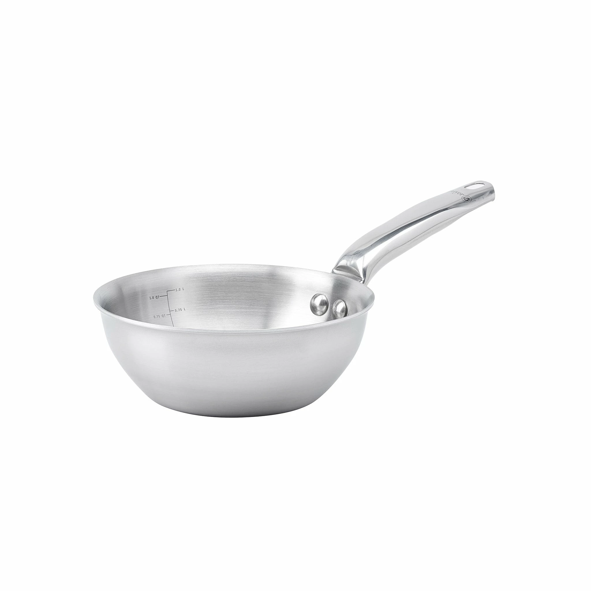 The saute pan has an ergonomic handle, cast from stainless steel and riveted to the pan for durability.Â