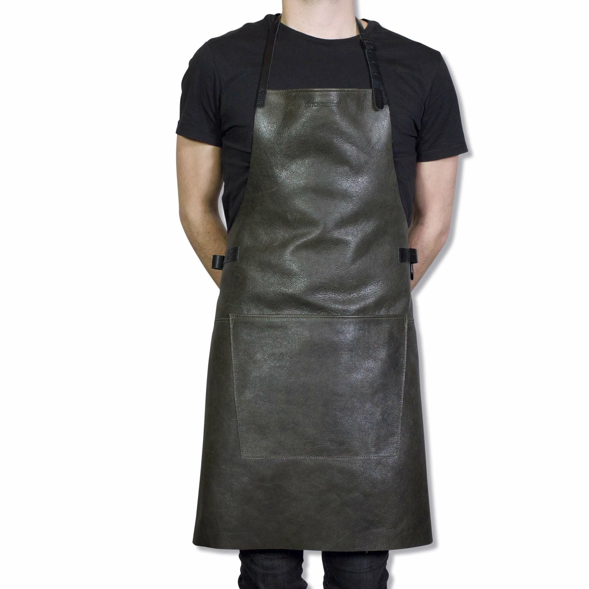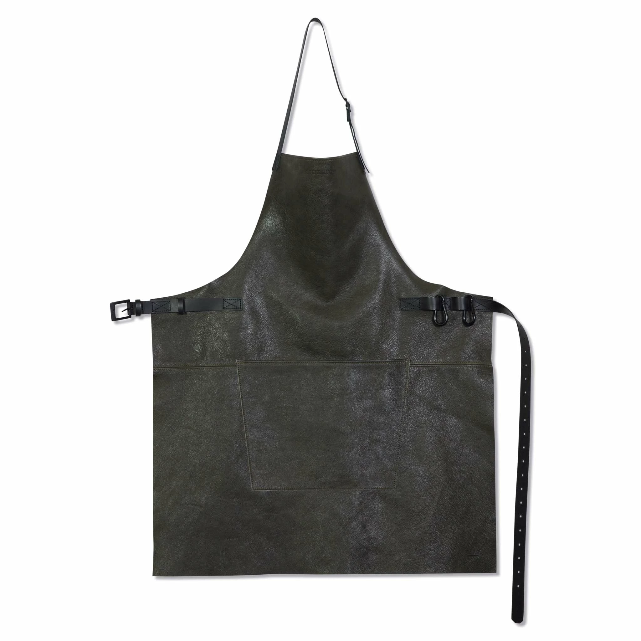 The handmade apron is made from 100% full grain leather and is finished in a transparent, dirt-repellent coating to keep it looking its best. The leather will soften and develop a patina over time – so the more you wear it, the better it will get! The apron has a fully adjustable neck strap, a large front pocket and towel loops at the waist. The apron also comes with carabiners, so you can keep things like tongs and spatulas close and keep your hands free.Â