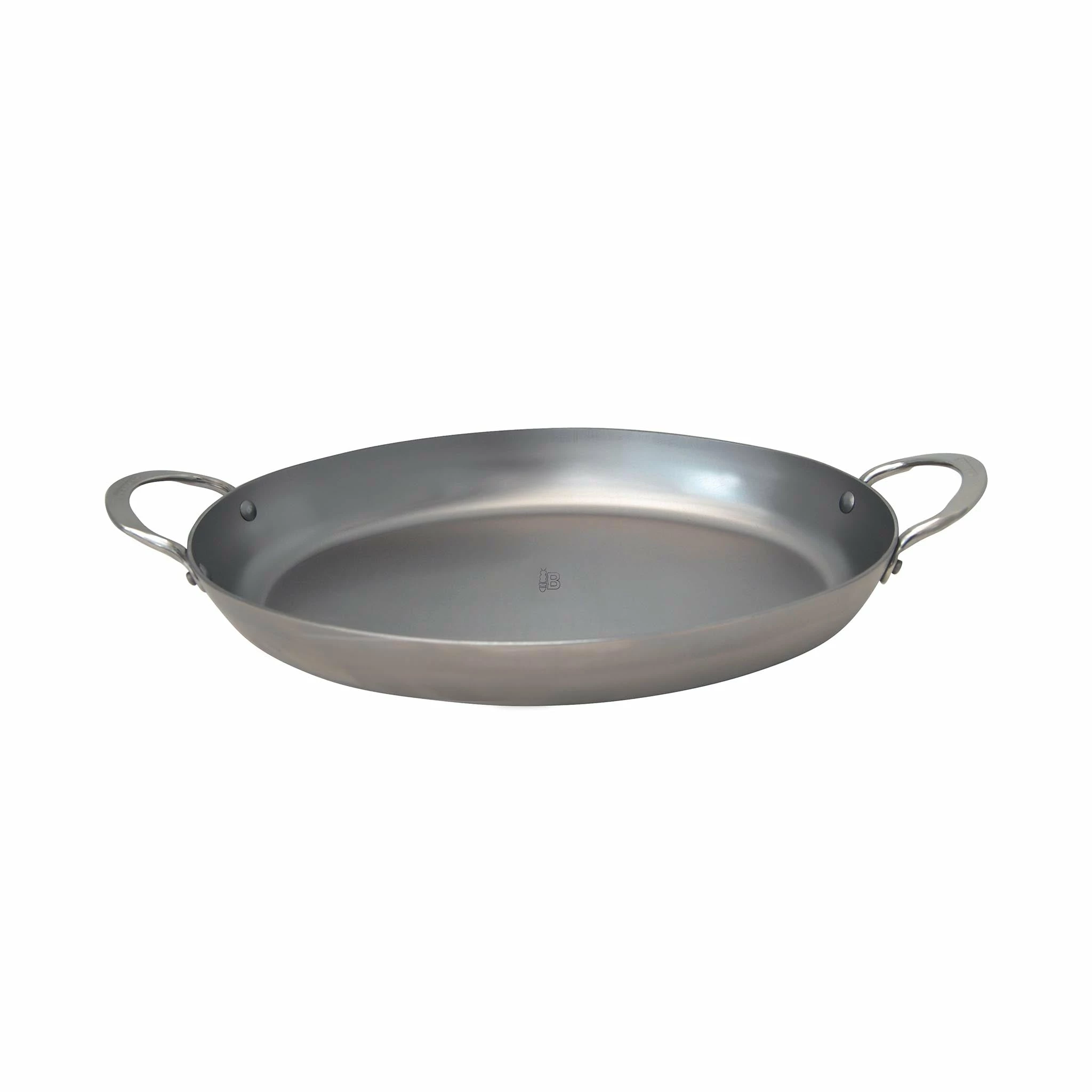 The De Buyer Mineral B ‘oval roasting pan requires proper seasoning to keep it in top condition. Before the first use, use hot water and a soft sponge to remove the beeswax coating. Then season the pan – pour in just enough oil to coat the bottom of the pan and bring to a high temperature. When a smoky-haze appears remove it from the heat and wipe well with kitchen towel. Now the pan is ready to use.