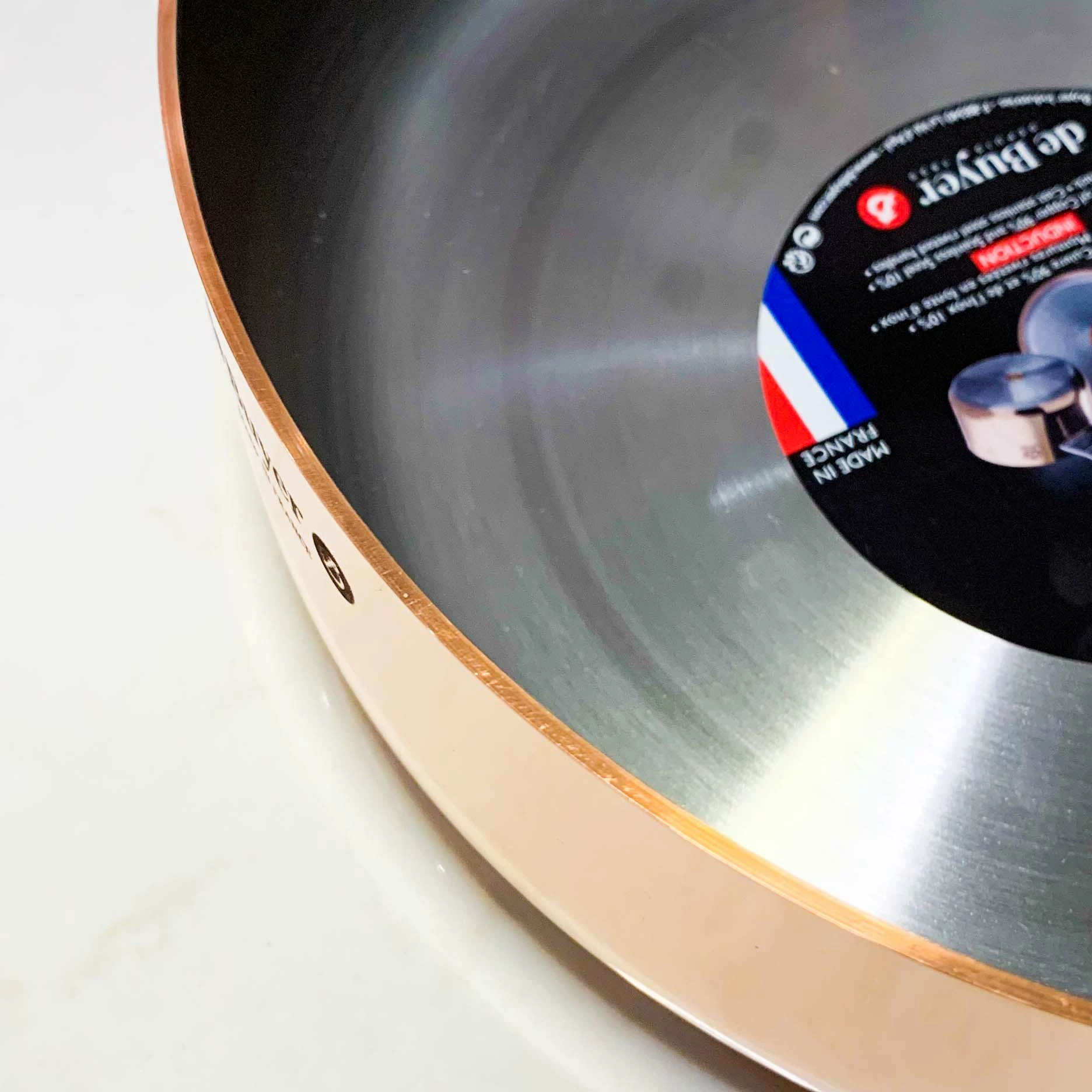 - 90% copper outside / 10% stainless steel lining – you can see the quality in the close-up image of the pan rim. The pans are a glorious 2mm thick.