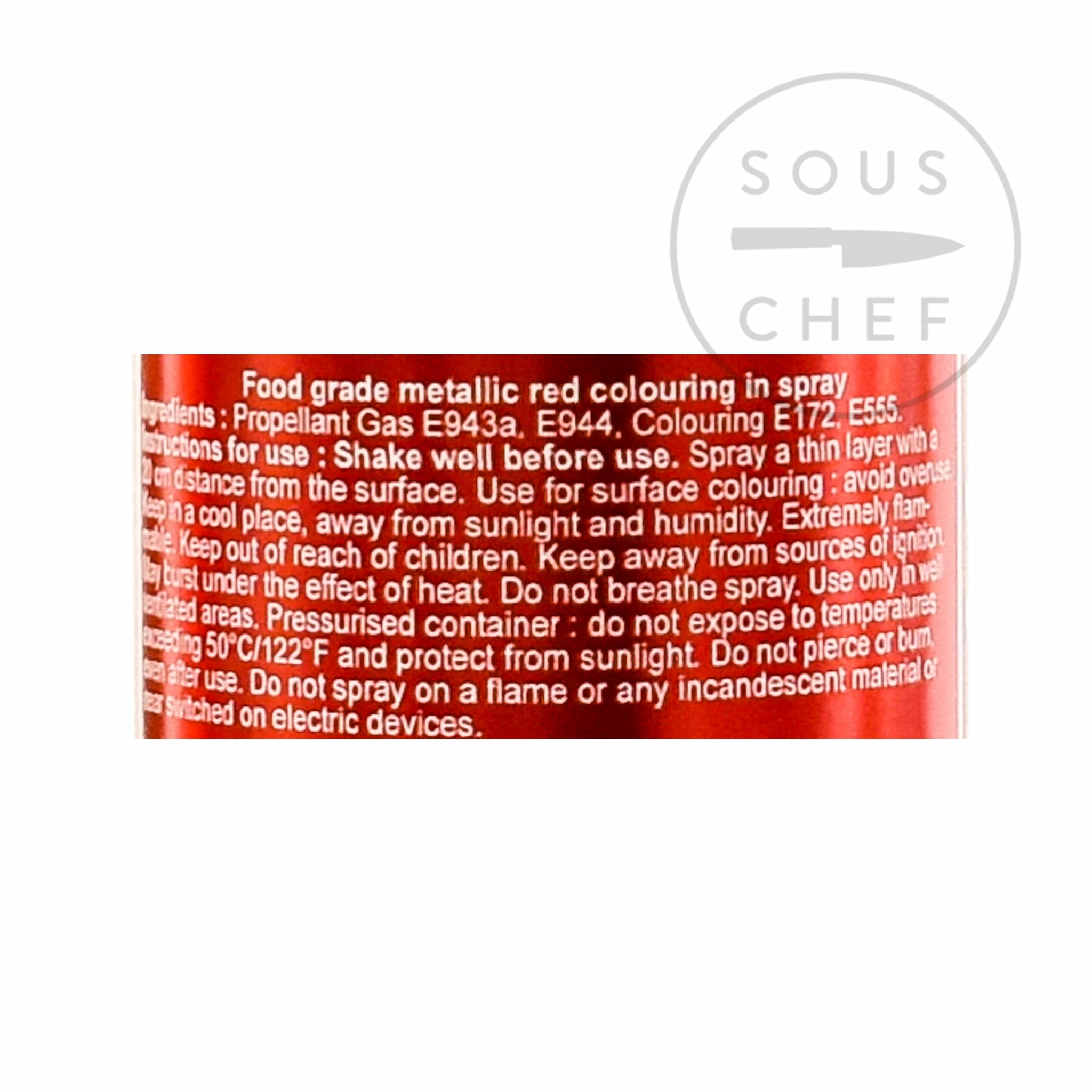 This edible metallic red spray brings a flawless metallic red coating to desserts, chocolates, icing and cakes. Use the edible metallic red food colouring spray can to create a fine metallic red finish on any patisserie. The metallic red finish looks spectacular – try adding a touch of glamour to a red velvet cake or to a batch of macarons.