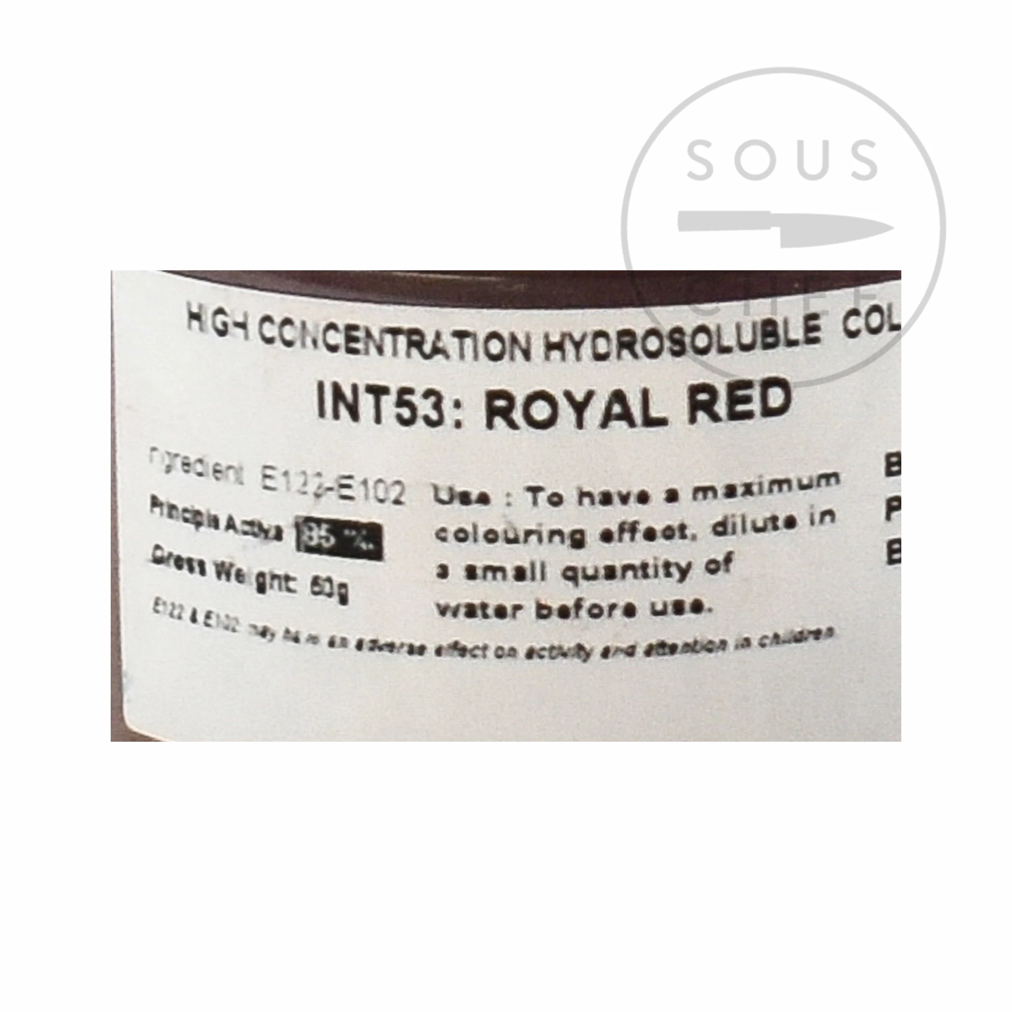 The intense red food colour is water soluble. For maximum effect, dilute in a small amount of water before use. Recommended use is 1tsp of colouring in 1tsp water to colour 2kg of sugar. Contains 50g, or approx 60ml, or 12 tsp – enough for 24kg sugar.Â