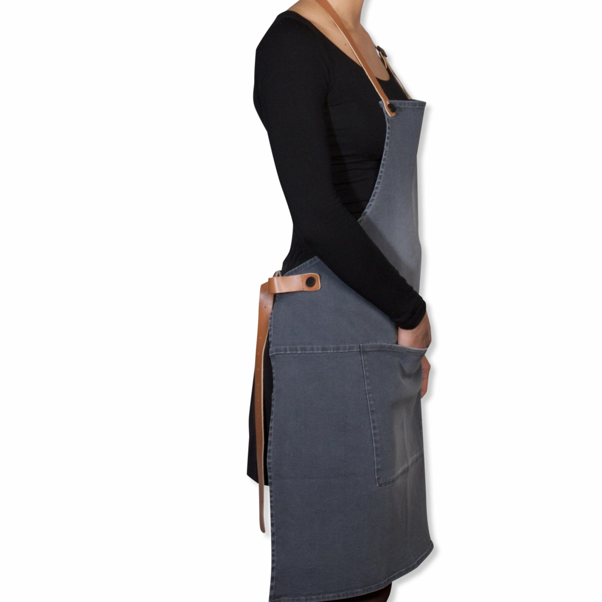 The handmade canvas denim apron has a slight stretch, making it comfortable to wear no matter what the task. The apron has a fully adjustable neck strap, a large front pocket and towel loops at the waist. The apron also comes with carabiners, so you can keep things like tongs and spatulas close and keep your hands free.Â