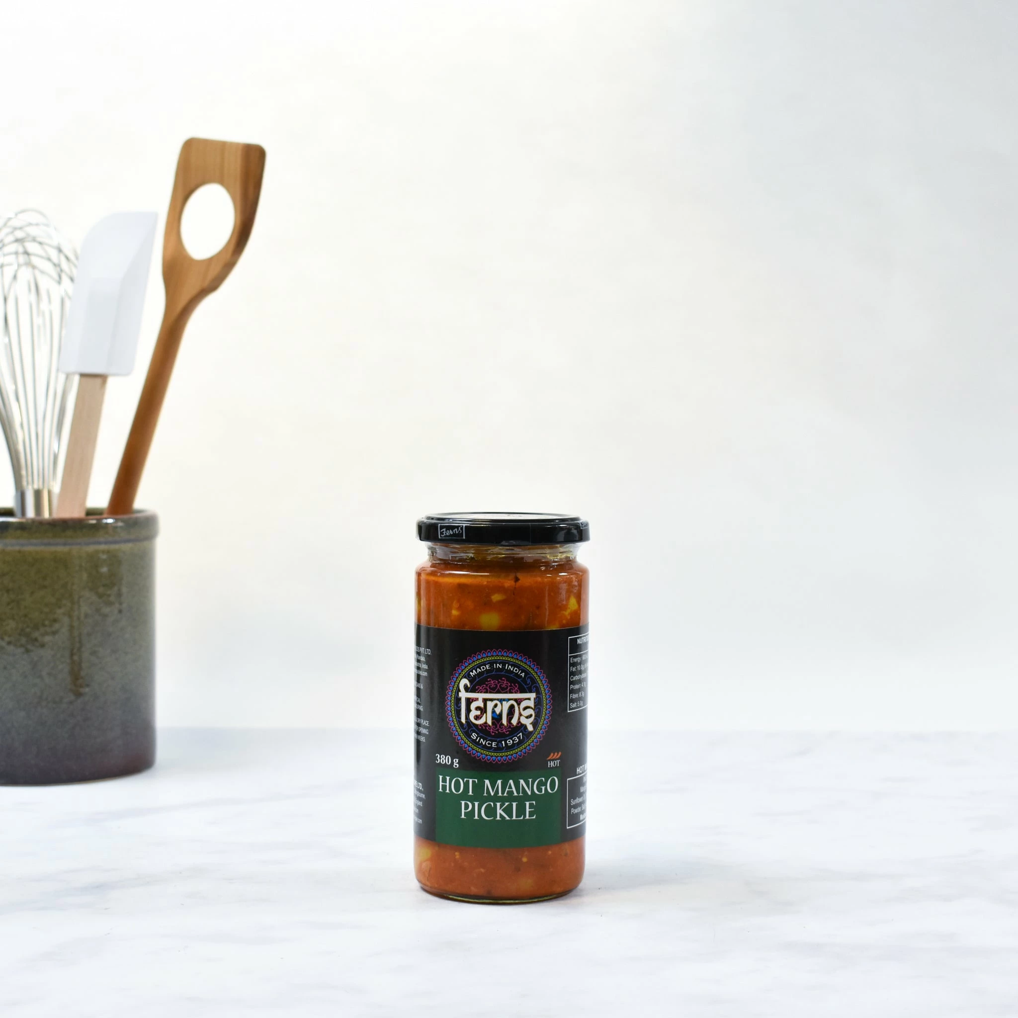 Ferns’ hot mango pickle is made from mangoes grown on wild mango trees, lending just that bit more bite to this tangy pickle. A spoonful of hot mango pickle makes a delectable fruity condiment with a real kick – perfect for accompanying curries and dipping breads.