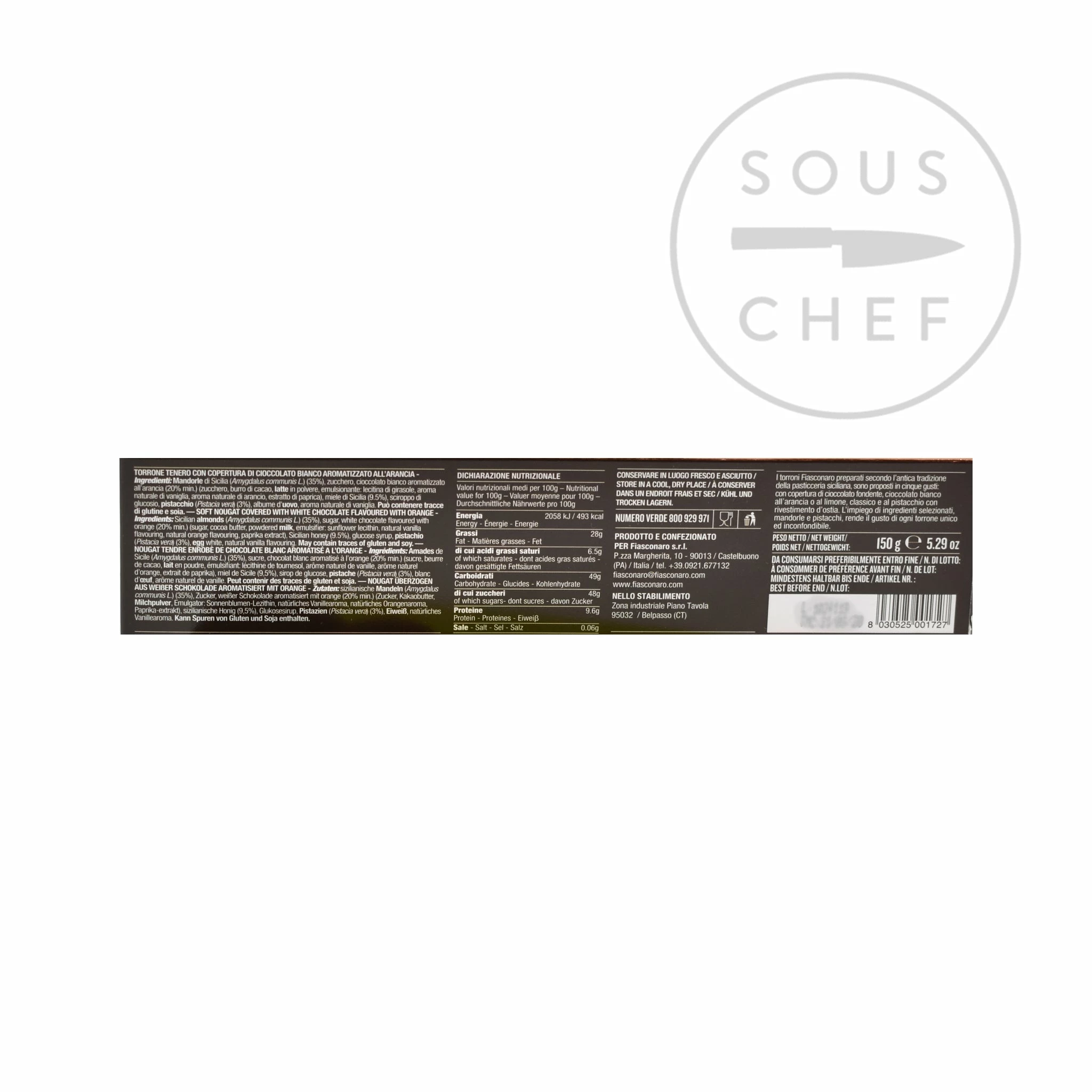 Ingredients: Sicilian almonds (Amygdalus communis L.) (35%), white chocolate flavoured with orange (20%min) (sugar, cocoa butter, powdered milk, emulsifier: sunflower lecithin, natural vanilla flavouring, natural orange flavouring, paprika extract.), Sicilian honey (9.5%), glucose syrup, pistachio (Pistacia vera) (3%), egg white, natural vanilla flavouring. May contain traces of gluten and soya. Allergens are listed in bold.