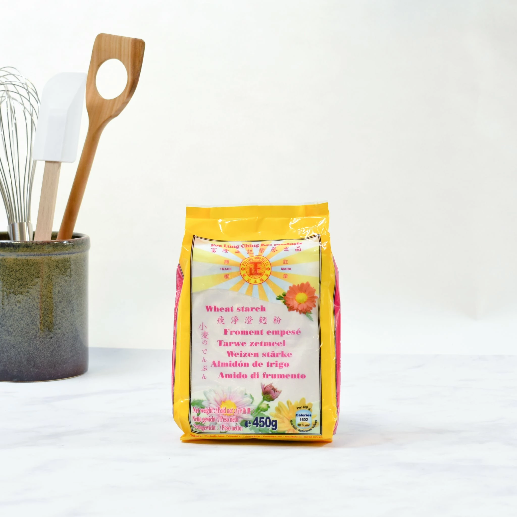 Wheat starch is a white flour used to make dumplings, doughs and to thicken sauces. Mix the light, fine wheat starch with water to create translucent white casings for steamed dim sum dumplings.