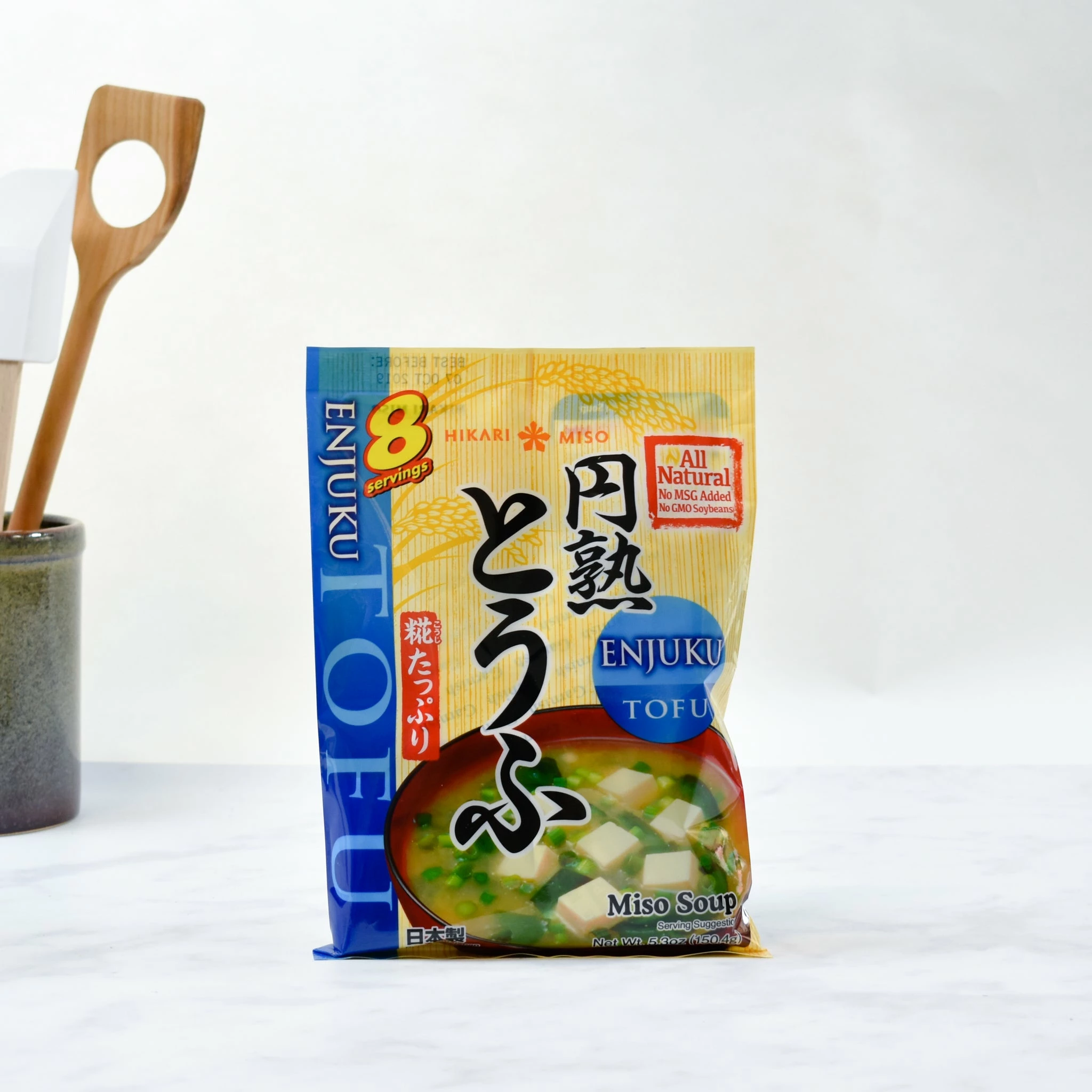 Serve the miso soup as the base to a quick meal, supplemented with a selection of seaweed, tofu or noodles. Also serve small bowls of miso soup with tofu as a course in a Japanese meal, cleansing the palette and aiding digestion. Or just enjoy as mid-morning snack in the office. Other flavours include Instant Miso With Wakame and Instant Miso With Green Onion