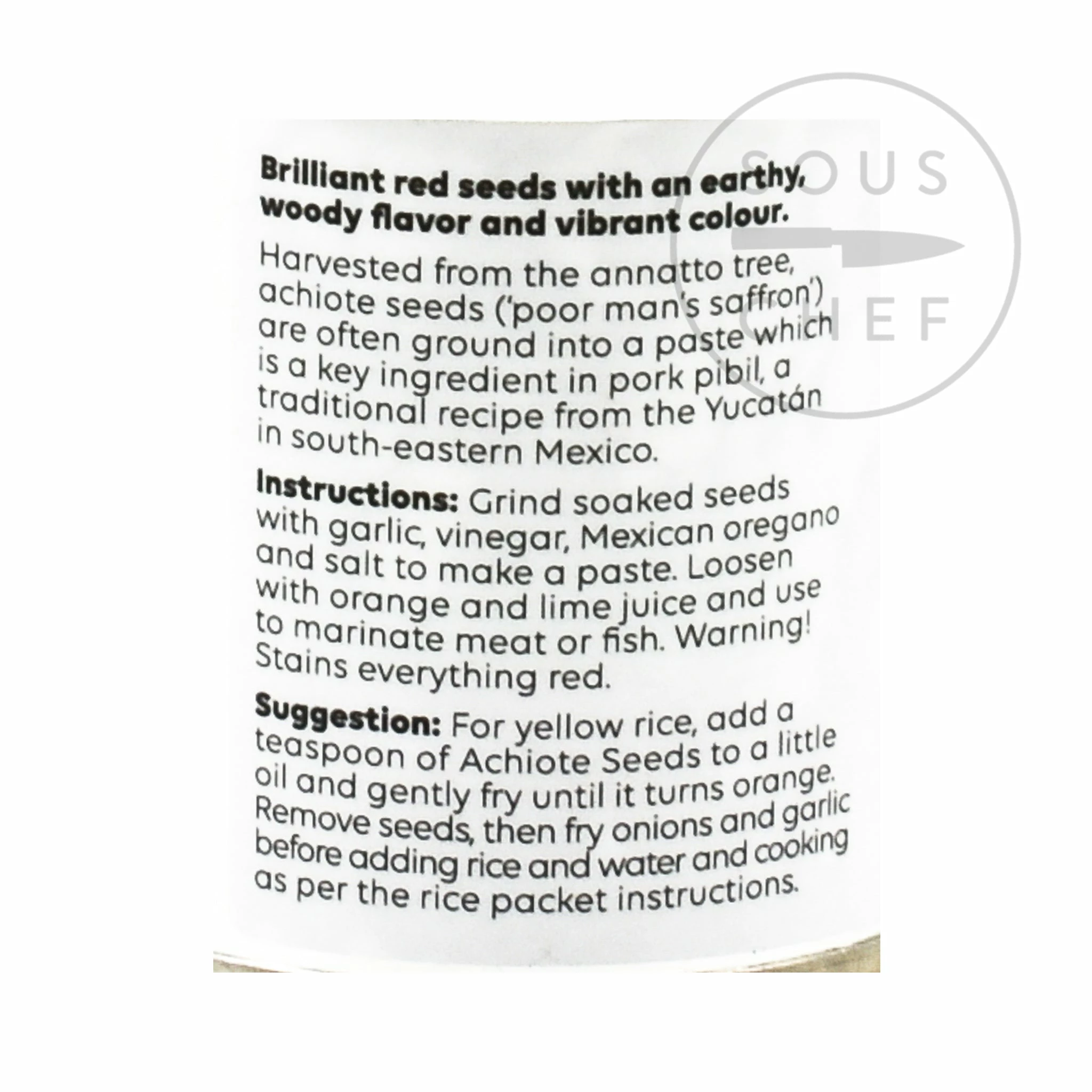 Ingredients: achiote seeds. May contain traces of sesame and almonds. Allergens are listed in bold.