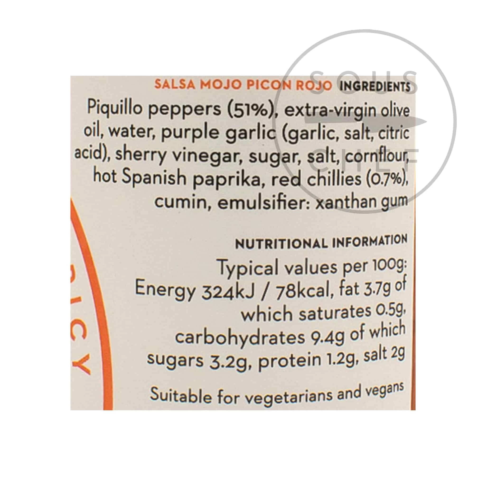 Delicioso salsa mojo picon rojo is garlicky pepper sauce with warm smoked paprika flavour. Made from Piquillo peppers which have a strong sweetness with a bitter hint, the smokey paprika adds rich warmth to this salsa without being overpowering.