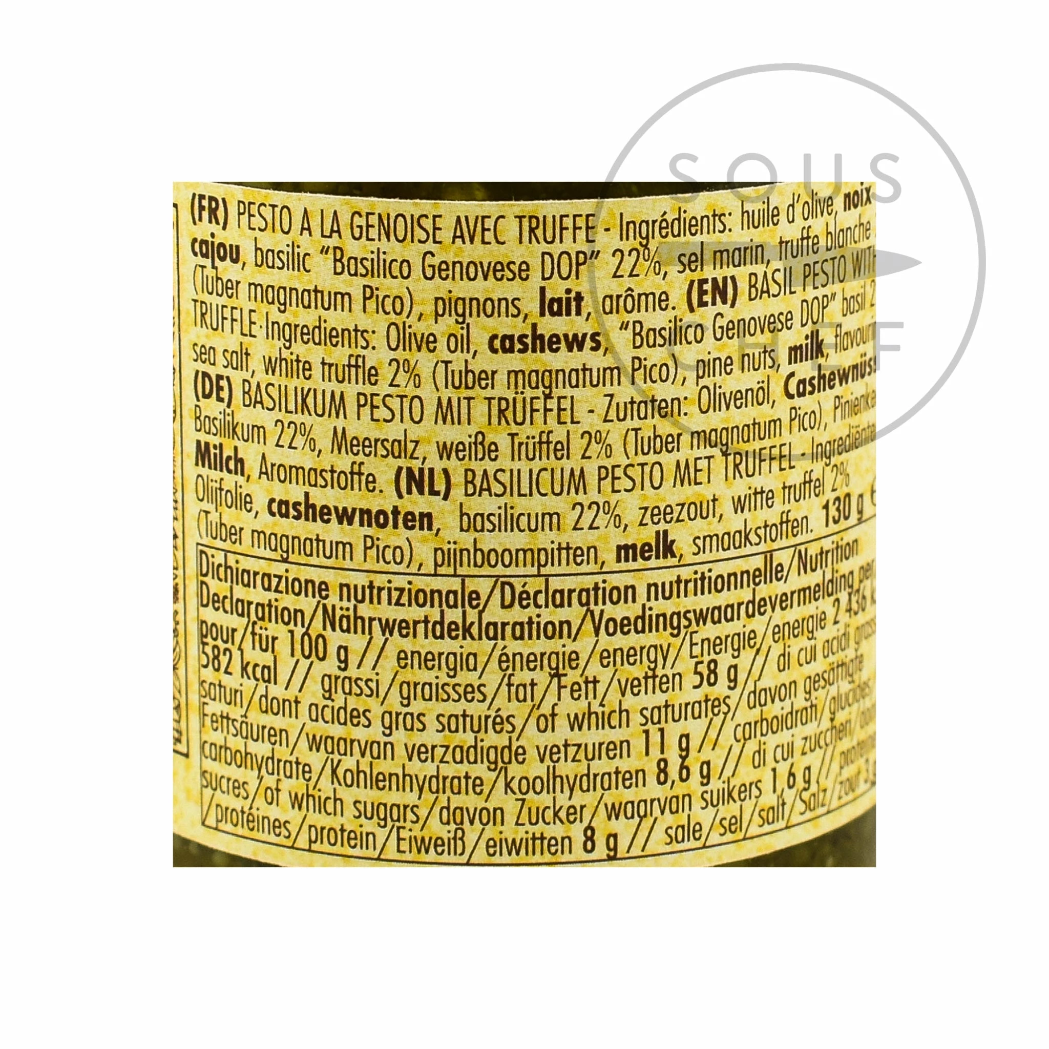 Ingredients: Olive oil, cashews, “Basilico Genovese DOP” basil 22%, sea salt, white truffle 2% (Tuber magnatum Pico), pine nuts, milk, flavouring.