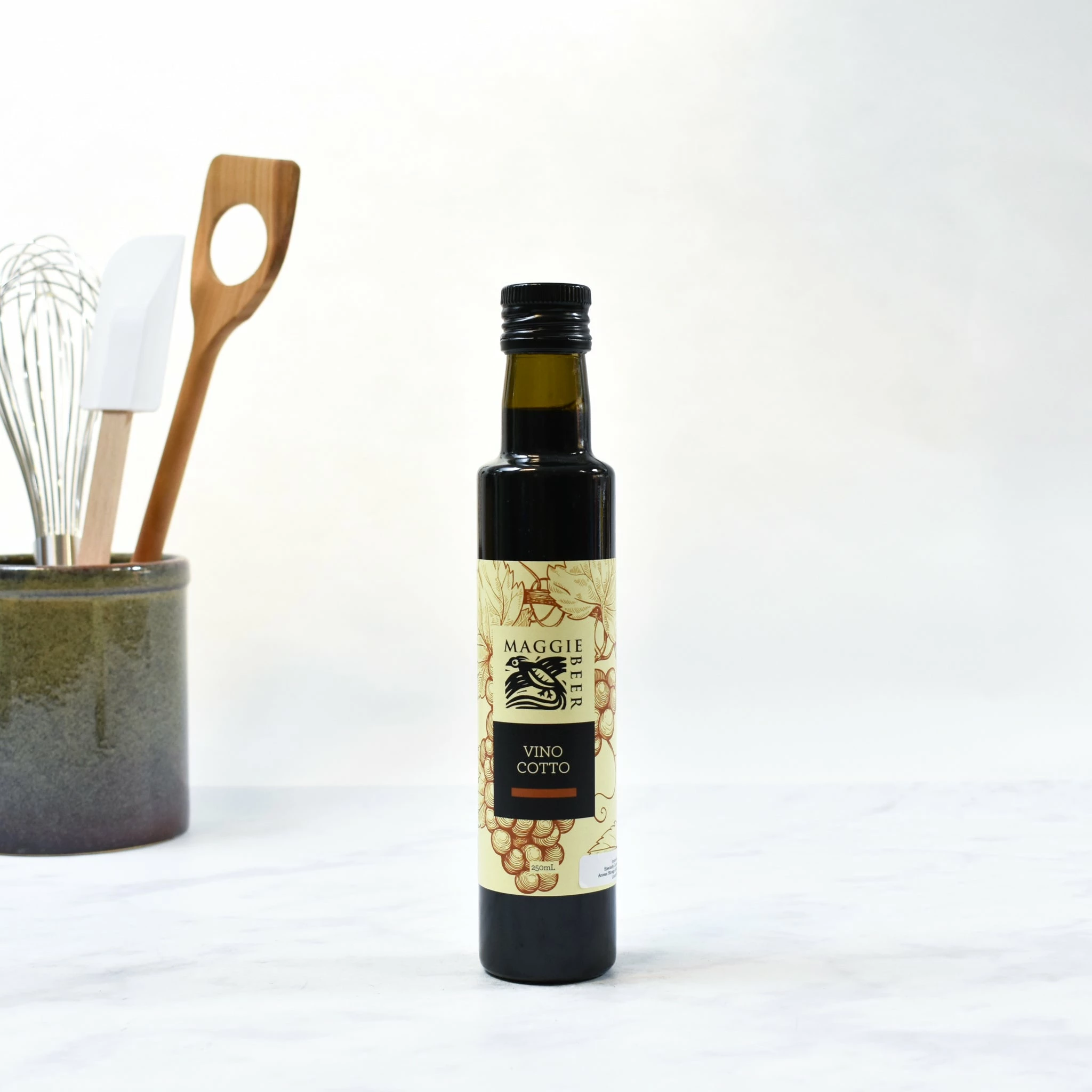 Vino Cotto is a unique sweet/sour or agrodolce dressing, which works in any situation where you might otherwise use balsamic vinegar. Inspired by Mediterranean cuisine, famous Australian chef Maggie Beer started producing the vino cotto at her vineyard in the Barossa Valley. Vino cotto is produced by heavily reducing grape must or juice to make a rich syrupy dressing.