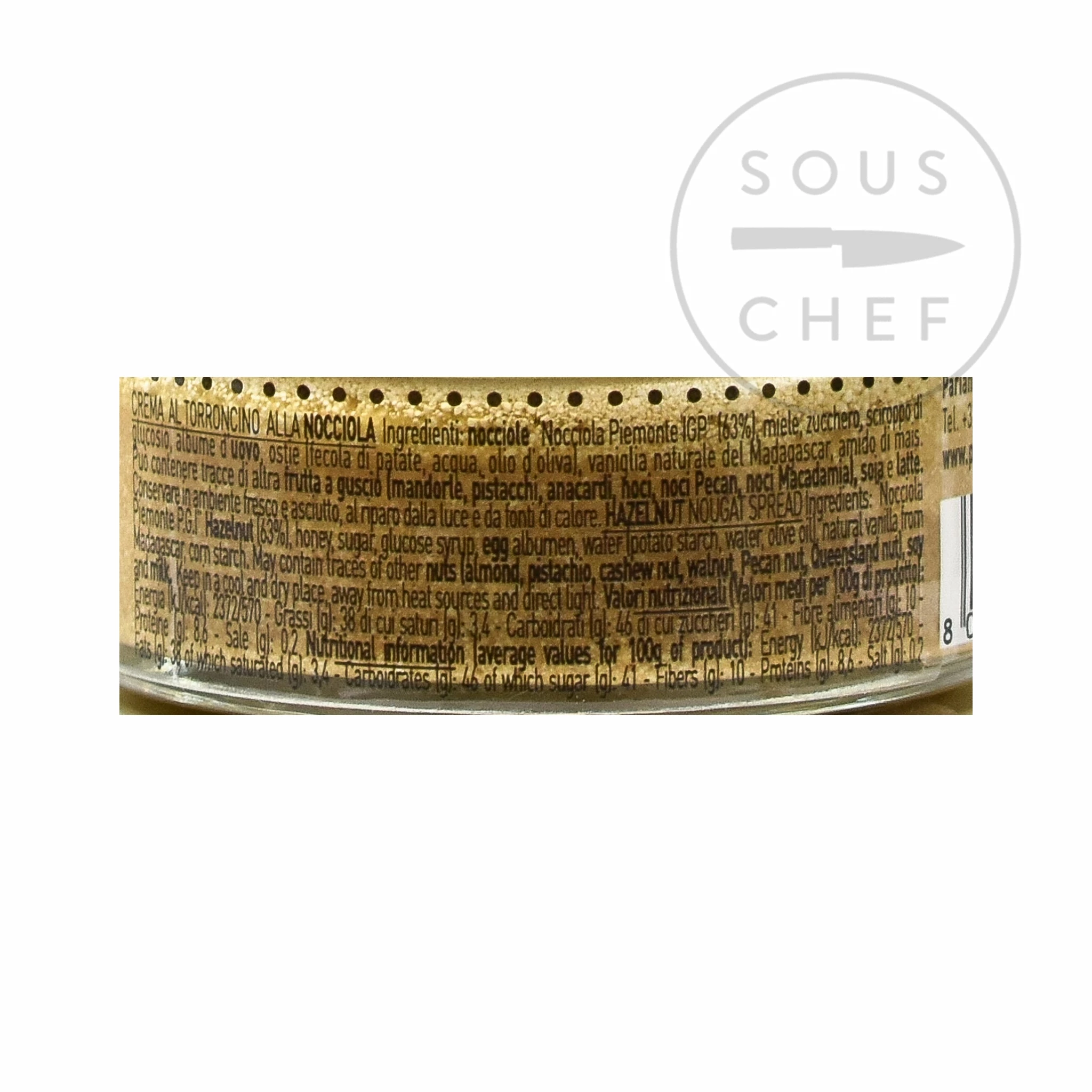 Ingredients: “Nocciola Piemonte IGP” hazelnuts (63%), honey, sugar, glucose syrup, egg albumen, wafer (potato starch, water, olive oil), natural vanilla from Madagascar, corn starch. Contains allergens: nuts, egg. May contain traces of other nuts, soy and milk.