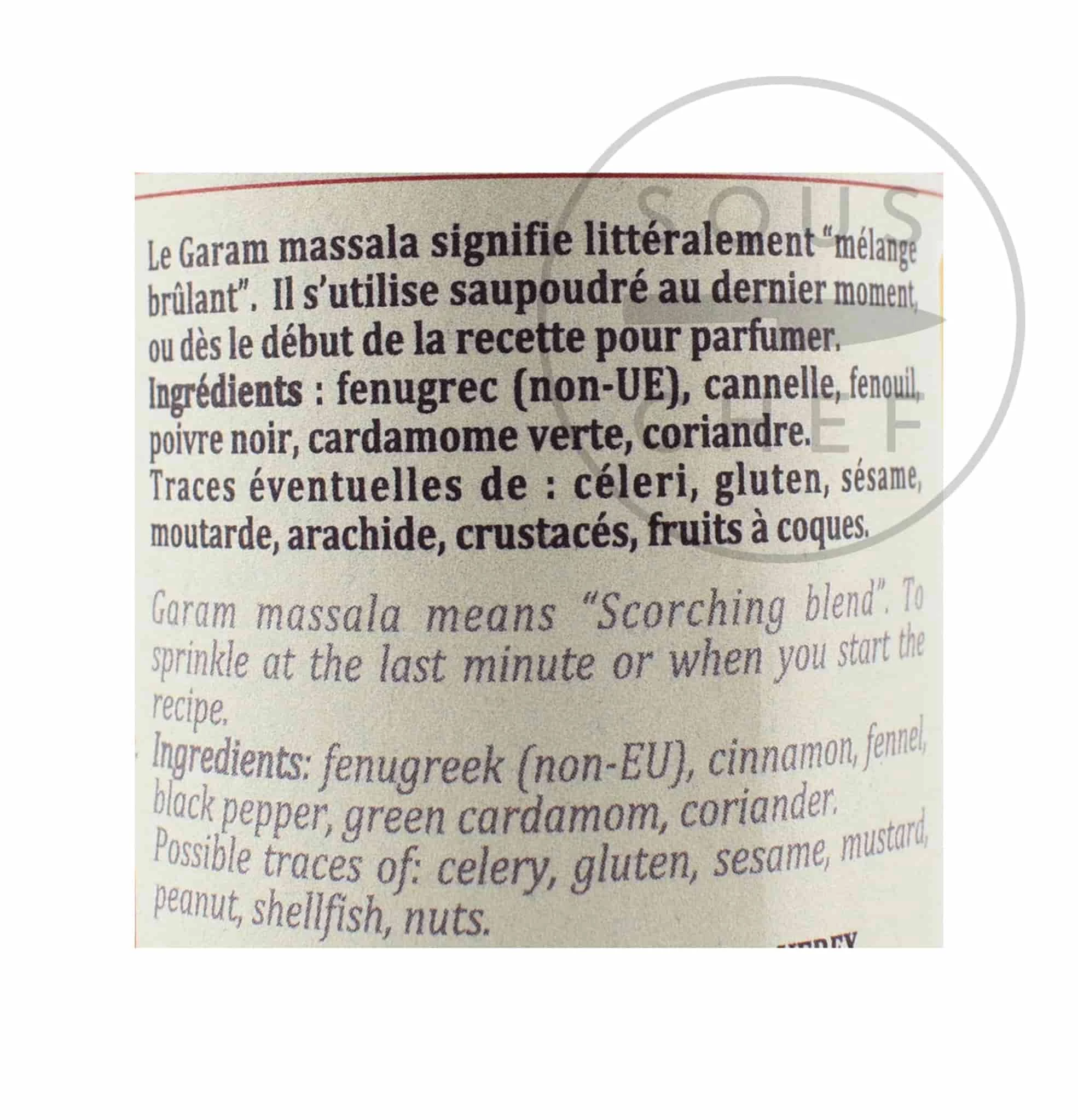 Terre Exotique’s garam masala is a Northern Indian spice blend, used alongside onions as the base for curries. In Hindi, garam translates as spicy, and masala translates as spice mix. This key spice mixture is made with fenugreek, cinnamon, fennel, black pepper, green cardamom and coriander – it has a warmth, slight smokiness and peppery kick.Â