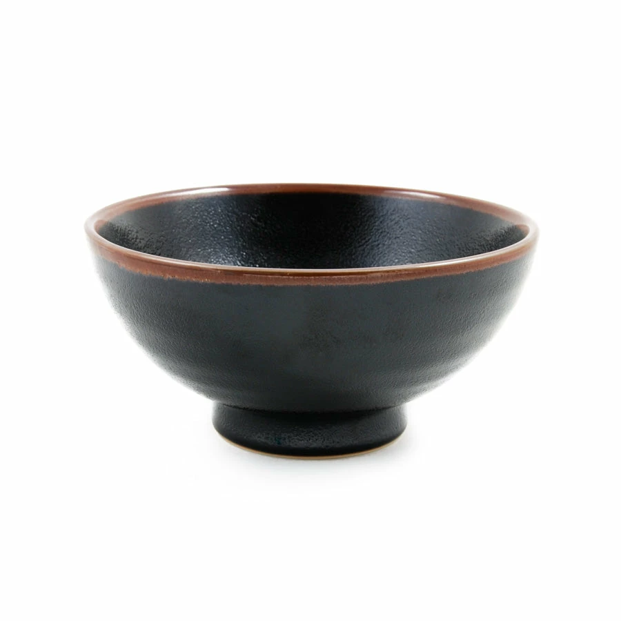 This black stoneware ramen bowl with a dimpled texture and brown rim makes for an attractive piece of tableware. The black glaze creates a dramatic background, working particularly well against both light food, such as rice dishes or chowders, and brightly-coloured soups or fresh salads.