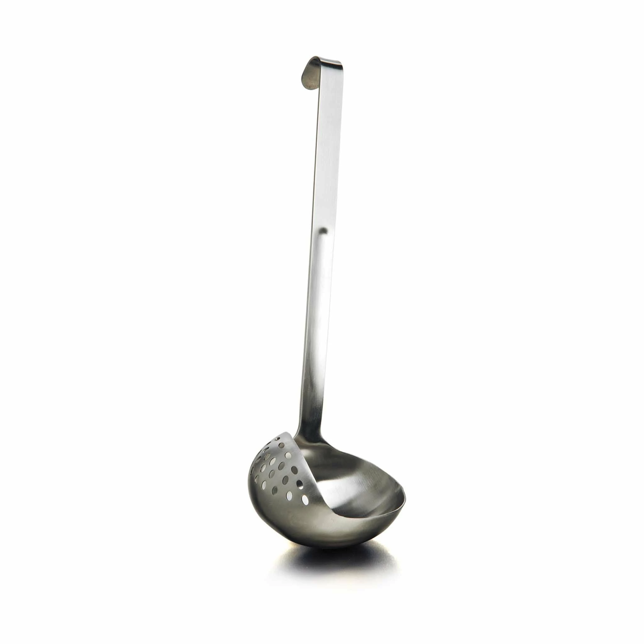 You can use this ingenious ladle just like any other ladle by holding it straight. Then, if you want to strain any excess liquid simply tip the contents to the side.