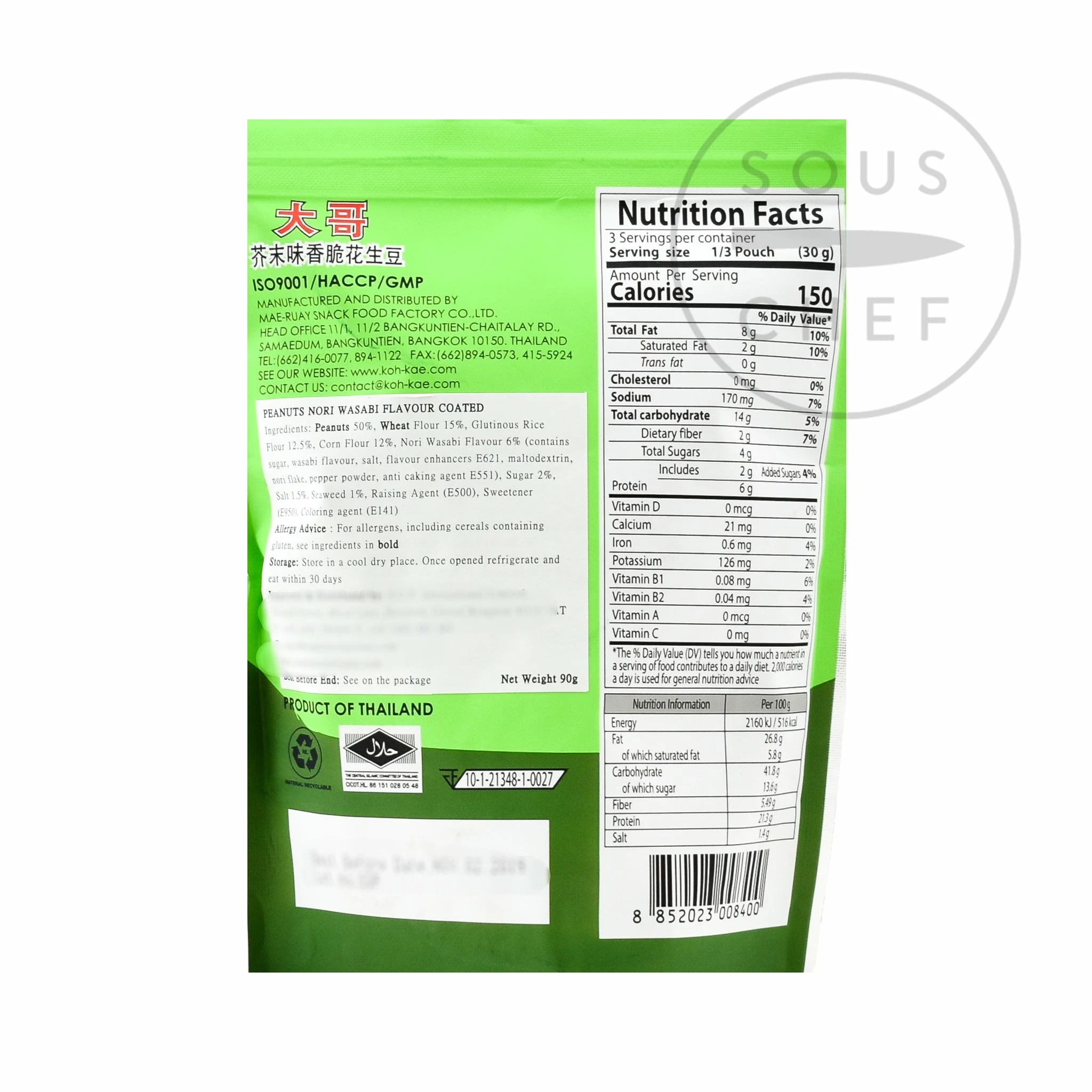 Ingredients: Peanuts (50%), wheat flour, glutinous rice flour, cornflour, nori wasabi flavour (6%) (sugar, wasabi flavour, salt, flavour enhancer e621; maltodextrin, nori flake, pepper powder, anticaking agent e551), sugar, salt, nori (seaweed), sweetener: acesulfame potassium e950; raising agent: sodium bicarbonate e500; colour: copper complexes of chlorophyllin e141. Allergens are listed in bold.Â