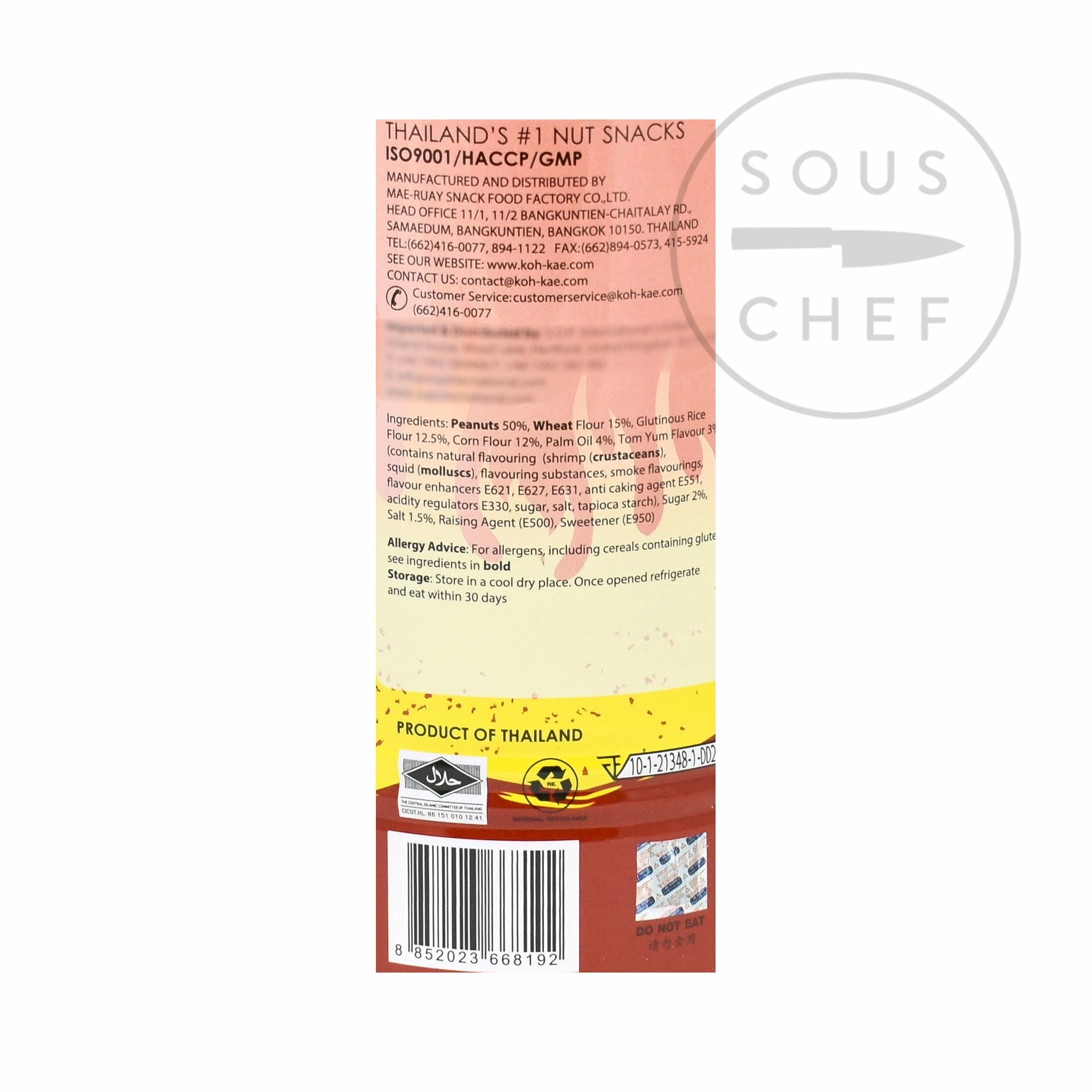 Ingredients: Peanuts (50%), wheat flour, glutinous rice flour, cornflour, palm oil, tom yum flavouring [natural flavouring )shrimp (molluscs), squid (crustaceans), flavouring substances, smoke flavouring, msg: e621; sodium guanylate: e627; disodium inosinate: e631; silicon dioxide: e551; citric acid: e330; sugar, salt, tapioca starch], sugar, salt, acesulfame potassium: e950; sodium bicarbonate: e500. Allergens are listed in bold.