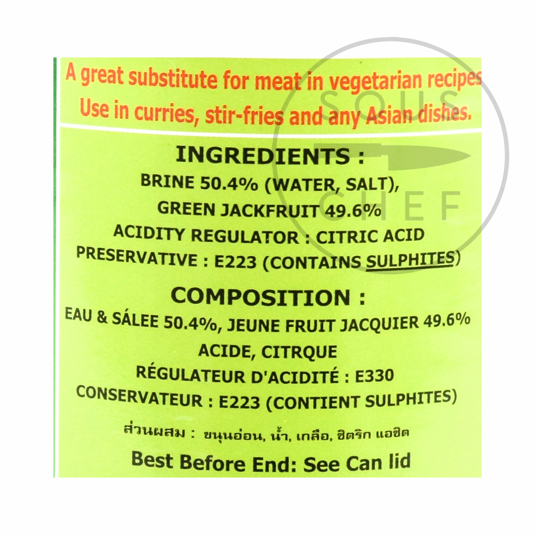 Ingredients: Brine 50.4% (Water, Salt), Green Jackfruit 49.6%, Acidity Regulator: Citric Acid, Preservative: E223 (contains sulphites)