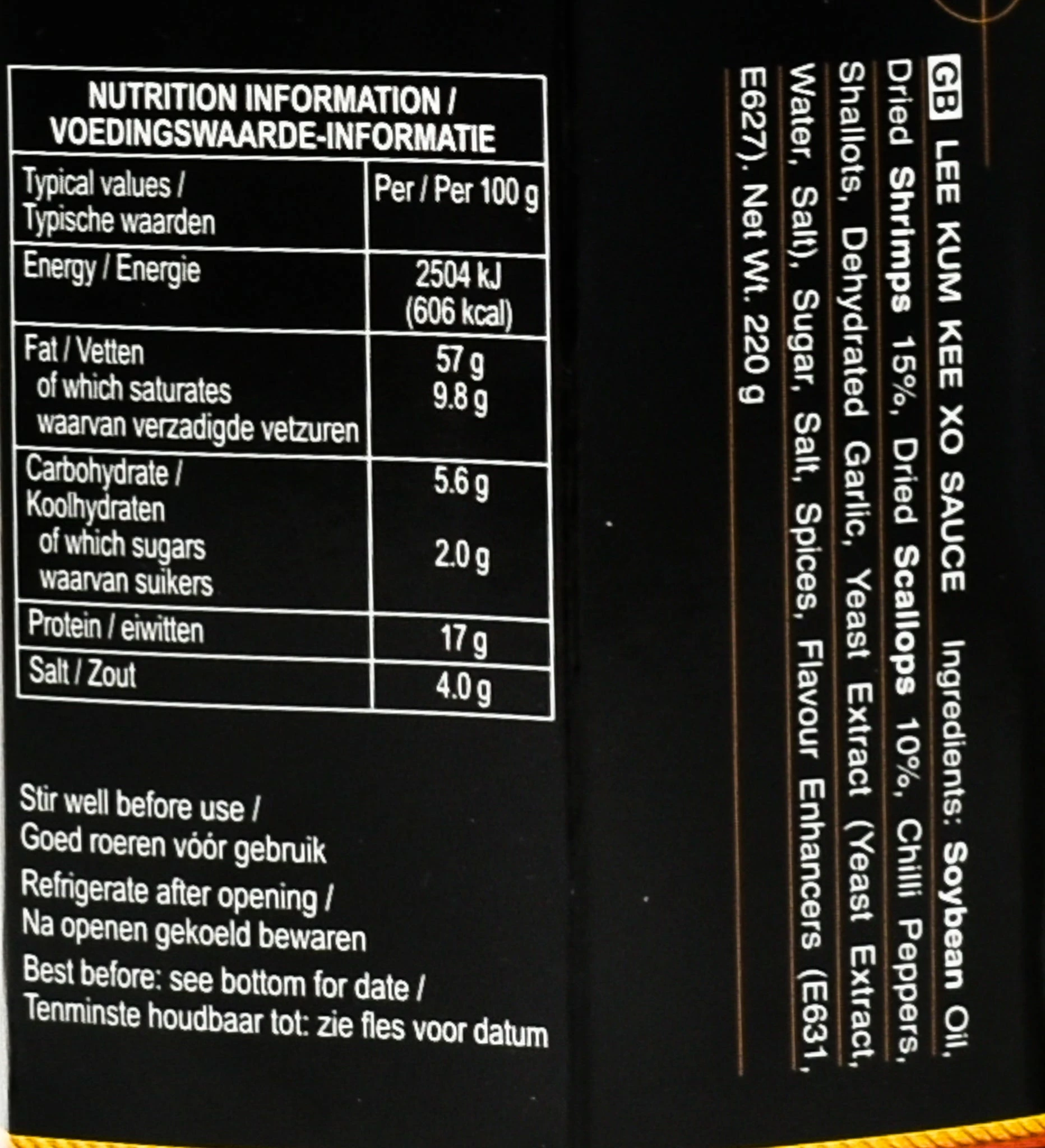 Ingredients: soybean oil, dried shrimps (15%), dried scallops (10%), chilli peppers, shallots, dehydrated garlic, yeast extract (yeast extract, water, salt), sugar, salt, spices, flavour enhancers (E631, E627).