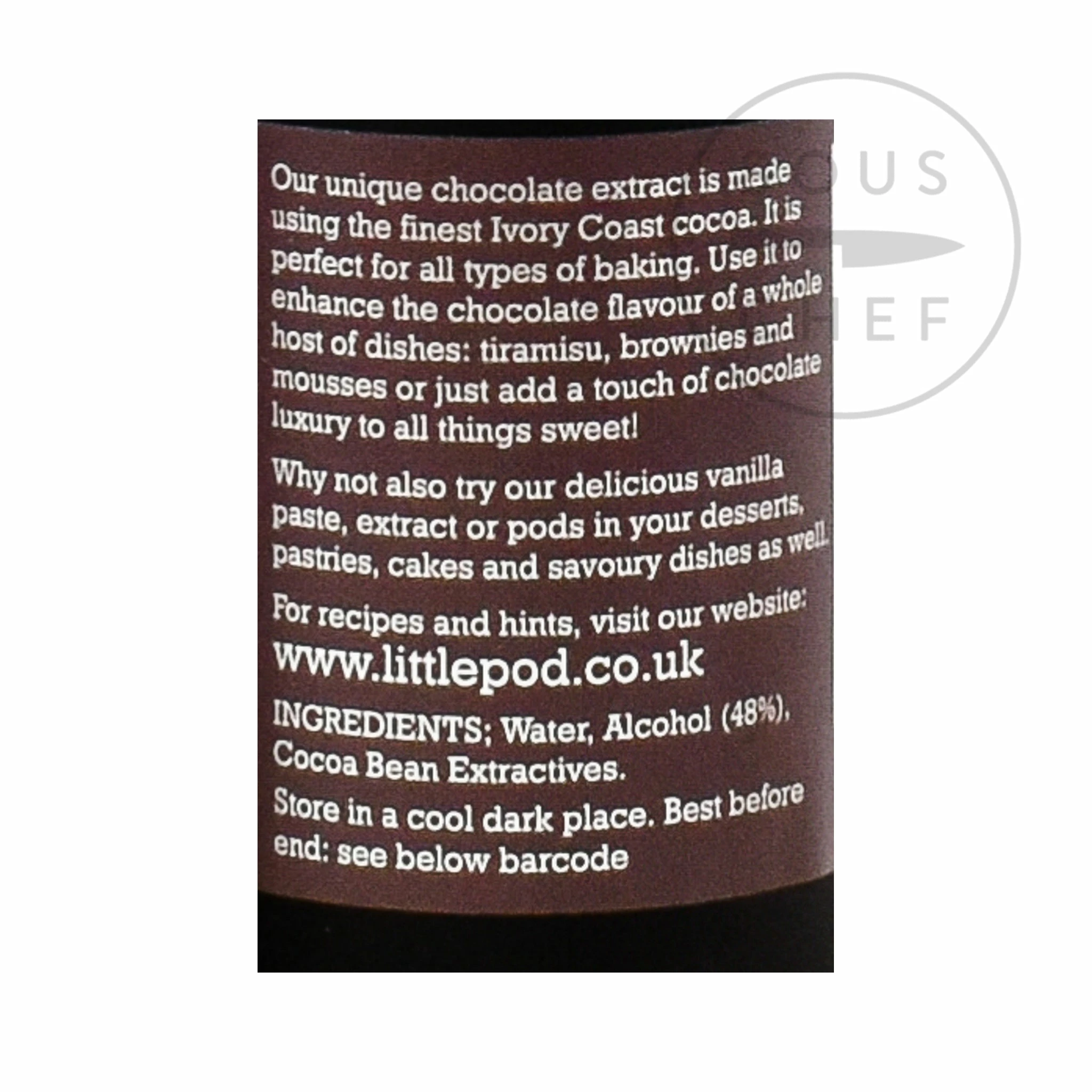Littlepod pure chocolate extract is a natural flavouring made from Ivory Coast cocoa beans, used in tiramisu, brownies, sponges and mousses. This chocolate extract adds an extra chocolate intensity to make different desserts and puddings stand out from the crowd.