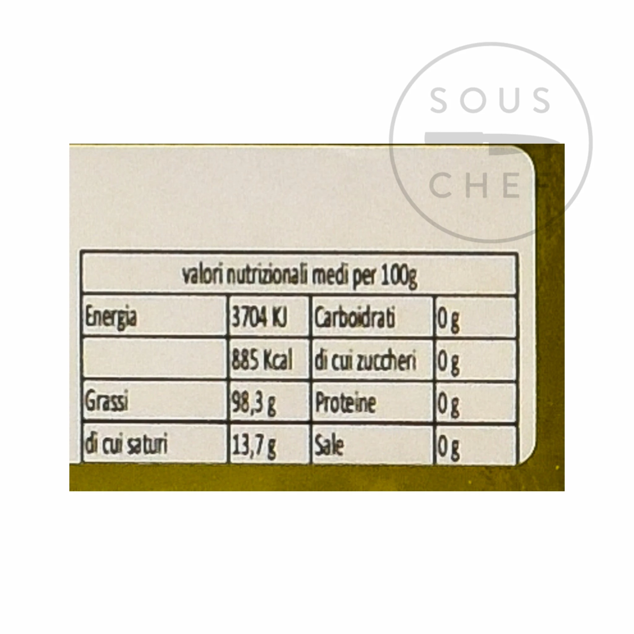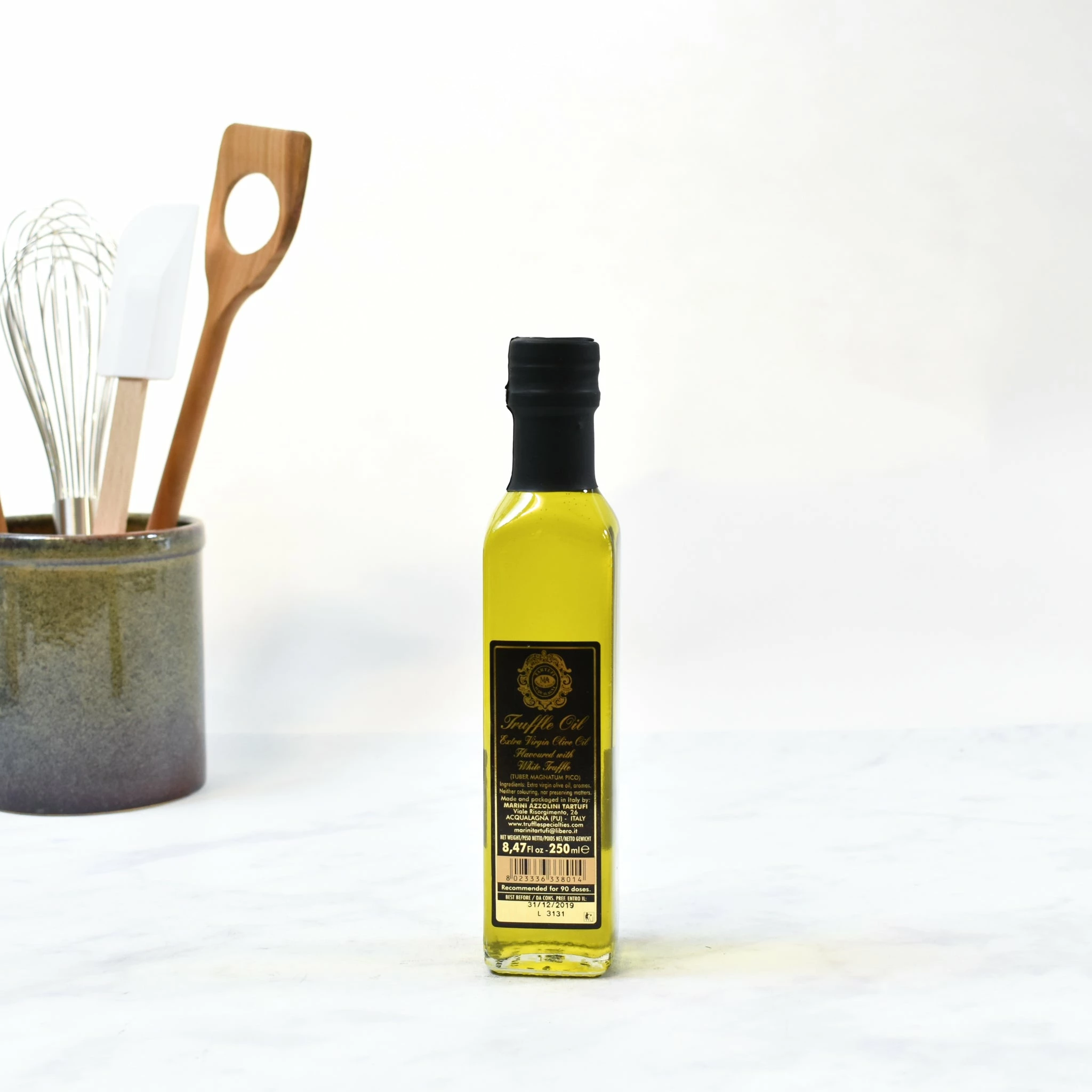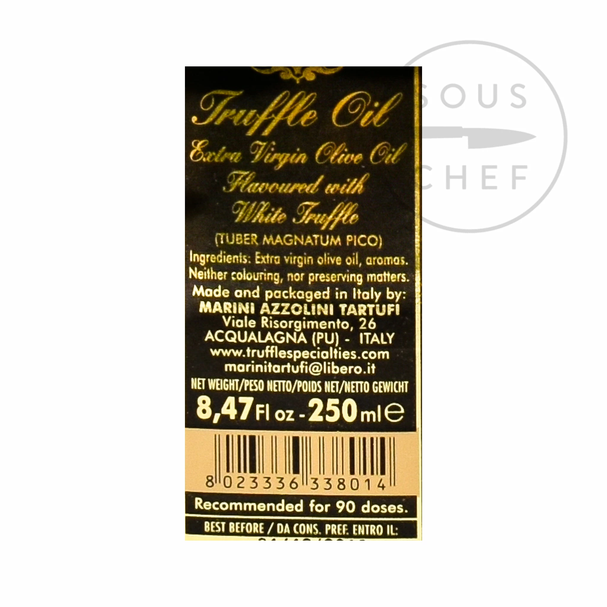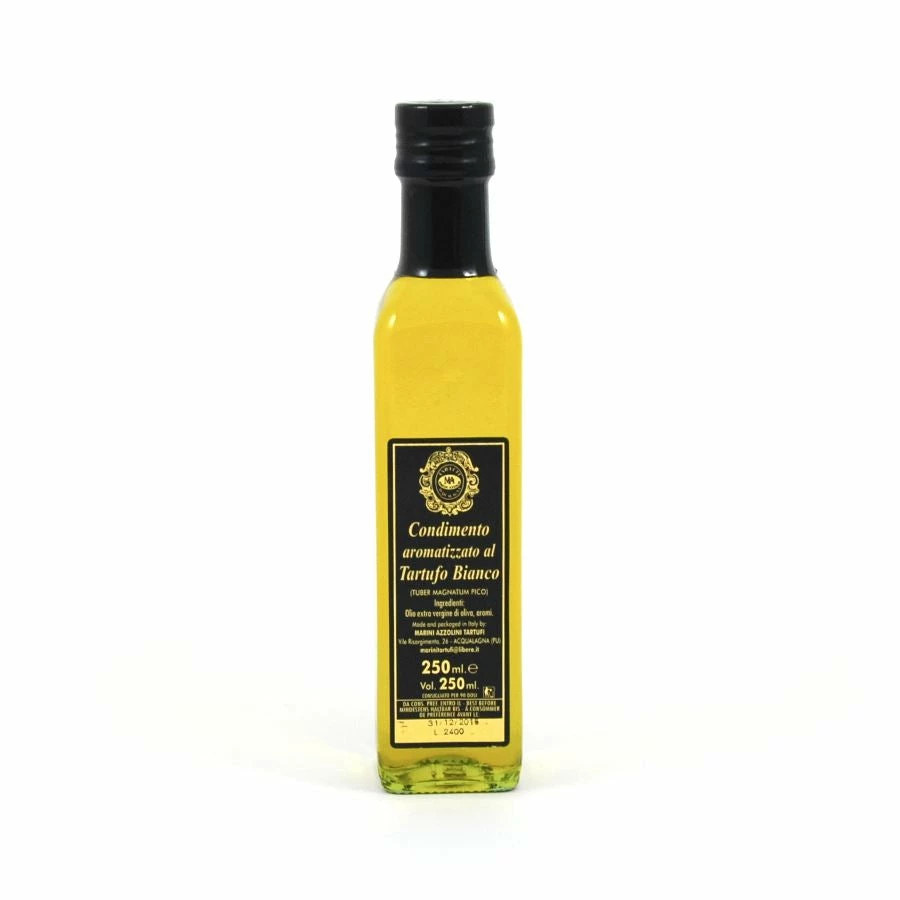 Ingredients: Extra virgin olive oil, truffle aroma (tuber magnatum pico). May contain traces of gluten, milk, celery, fish, nuts.