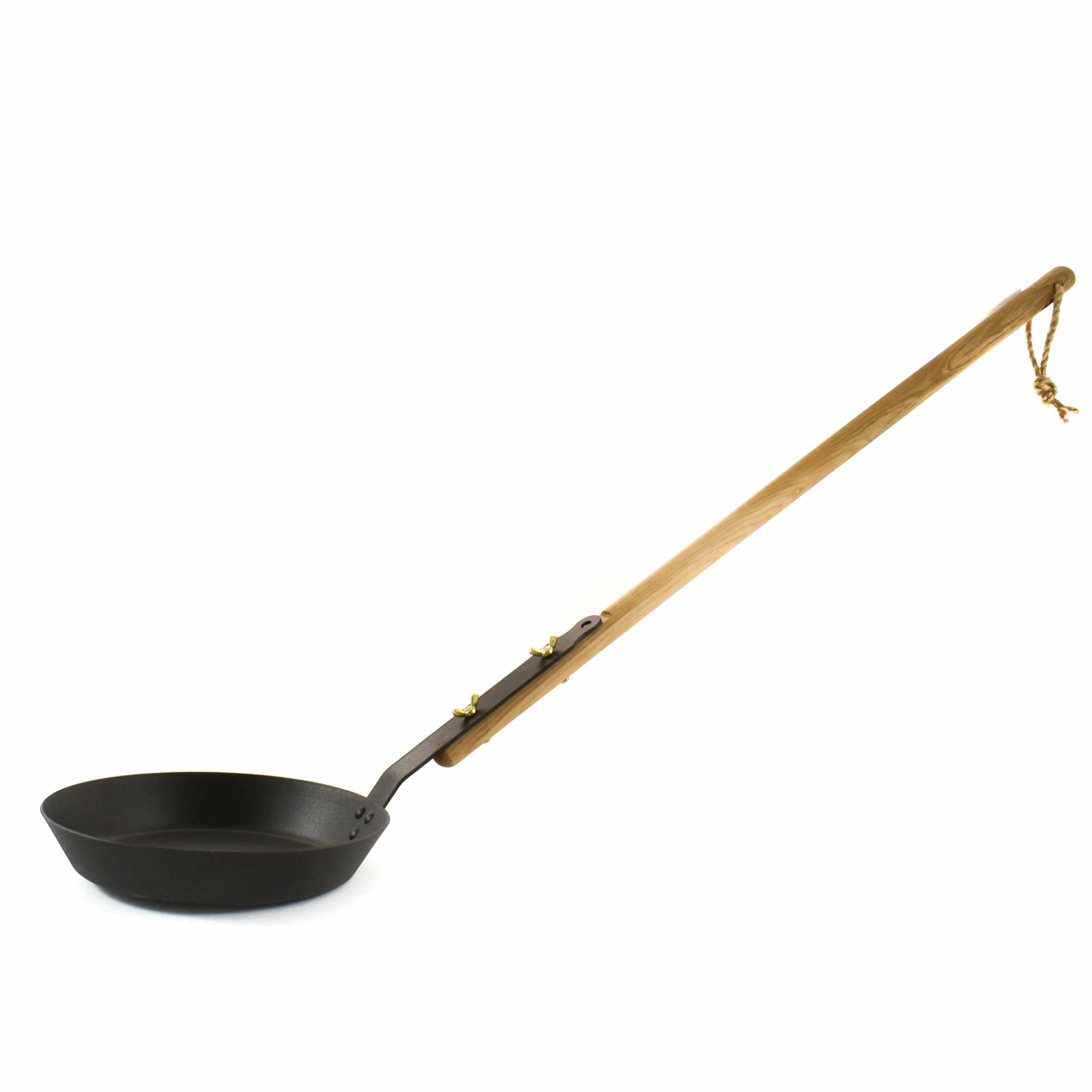 This hand-spun pan is made from 99.1% pure iron, with a long oak handle. The extra long handle makes this pan safe to use on campfires and fire pits, but for more versatility, remove the handle to use the pan indoors on hobs (including induction), in the oven or grill.