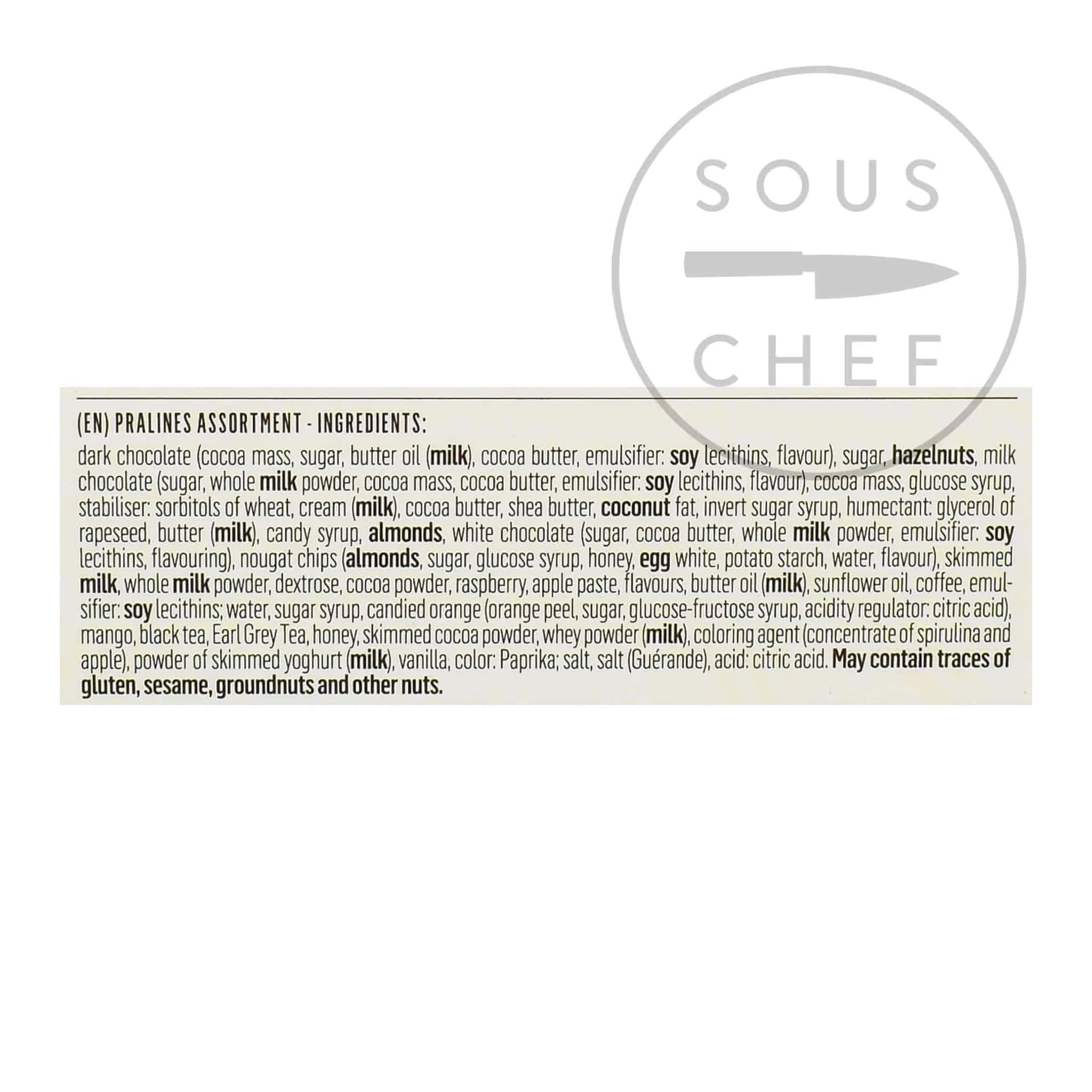 Ingredients: dark chocolate (cocoa mass, sugar, butter oil (milk), cocoa butter, emulsifier: soy lecithins, flavour), sugar, hazelnuts, milk chocolate (sugar, whole milk powder, cocoa mass, cocoa butter, emulsifier: soy lecithins, flavour), cocoa mass, glucose syrup, stabiliser: sorbitols of wheat, cream (milk), cocoa butter, shea butter, coconut fat, invert sugar syrup, humectants: glycerol of rapeseed, butter (milk), candy syrup, almonds, white chocolate (sugar, cocoa butter, whole milk powder, emulsifier: soy lecithins, flavour), nougat chips (almonds, sugar, glucose syrup, honey, egg white, potato starch, water, flavour), skimmed milk, whole milk powder, dextrose, cocoa powder, raspberry, apple paste, flavours, butter oil (milk), sunflower oil, coffee, emulsifier: soy lecithins; water, sugar syrup, candied orange (orange peel, sugar, glucose-fructose syrup, acidity regulator: citric acid), mango, black tea, Earl Grey Tea, honey, fat reduced cocoa powder, whey powder (milk), coloring agent (concentrate of spirulina and apple), skimmed yoghurt powder (milk), vanilla, colour: paprika extract, salt, salt (Guérande), acid: citric acid.Â