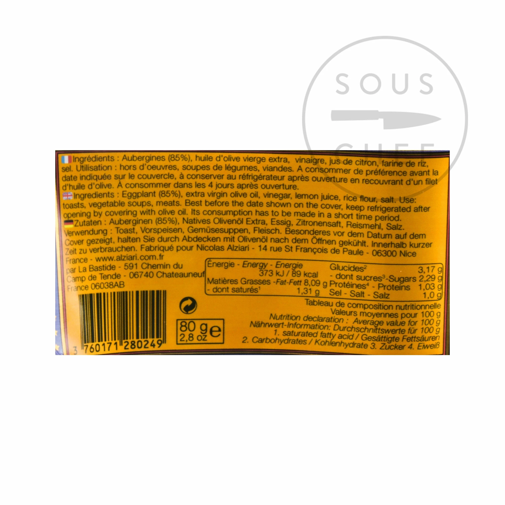 Ingredients: eggplant (85%), extra virgin olive oil, lemon juice, vinegar, rice flour, salt, natural flavours.