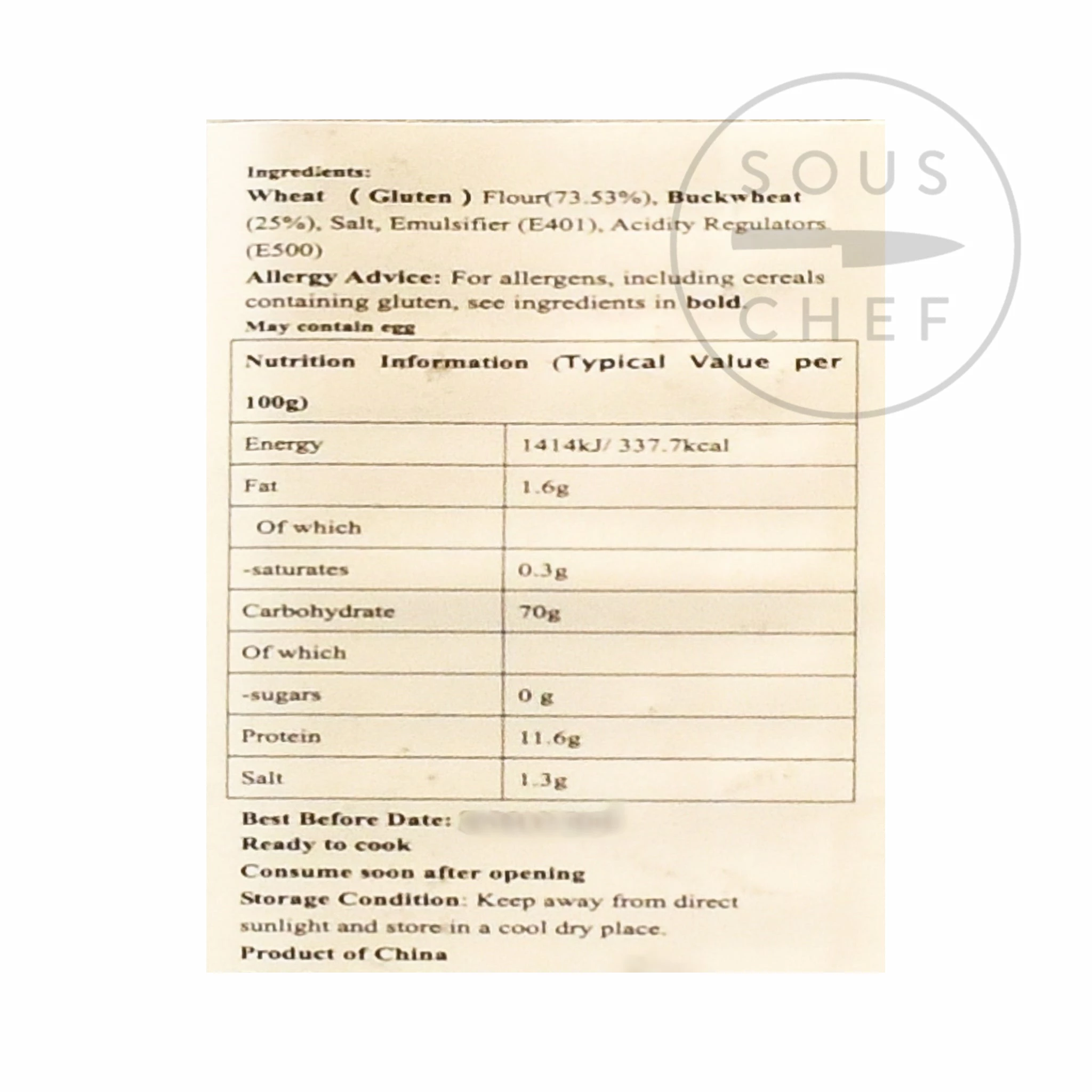 Ingredients: wheat flour (73.53%), buckwheat (25%), salt, emulsifier: E401, acidity regulator: E500. Contains allergens: gluten (wheat).Â