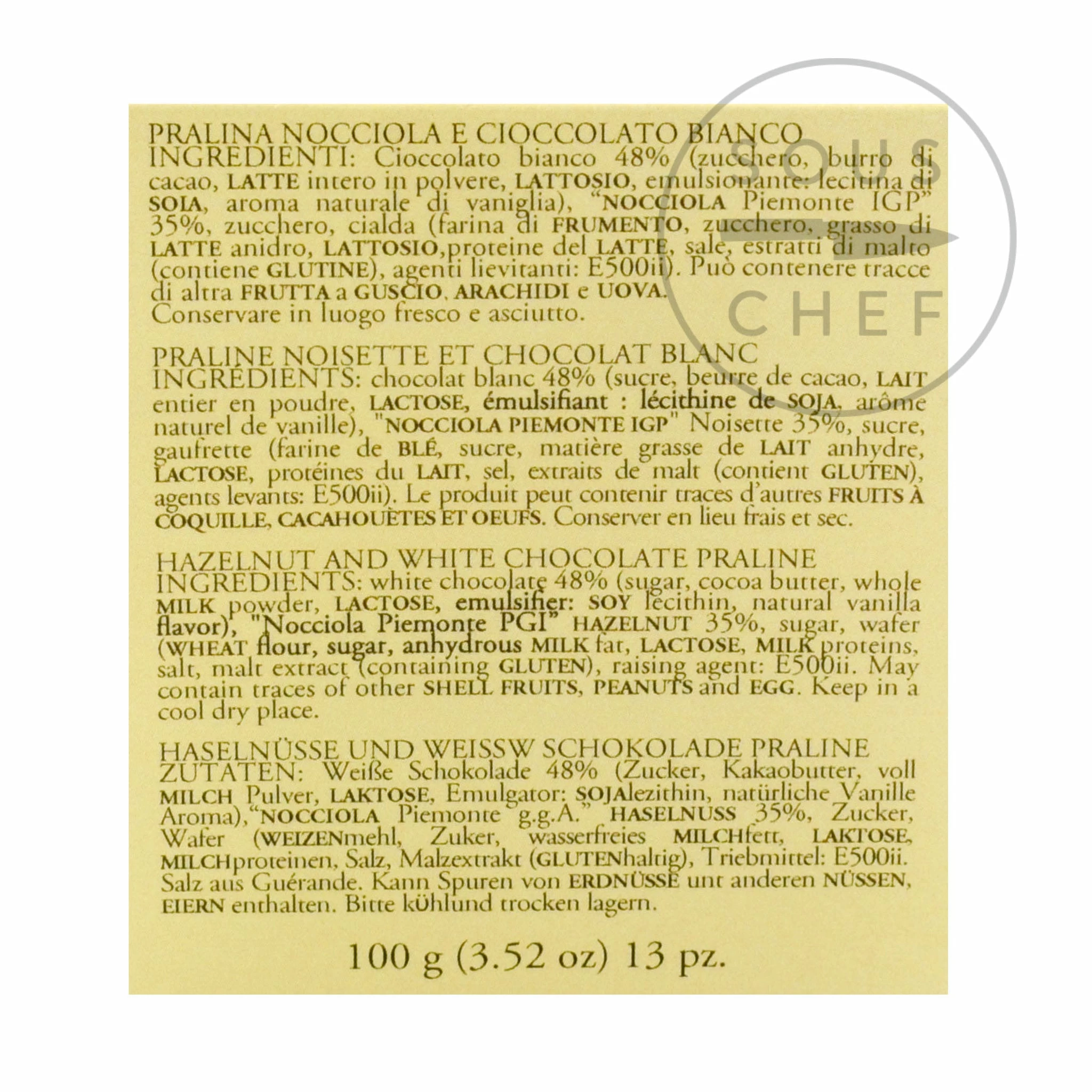 Ingredients: White chocolate (sugar, cocoa butter, whole milk powder, lactose, emulsifier: soy lecithin, natural vanilla flavor), ‘Nocciola Piemonte PGI’ hazelnuts 35%, sugar, wafer (wheat flour, sugar, anhydrous milk fat, lactose, milk proteins, salt, malt extract (barley), raising agents: E500ii).