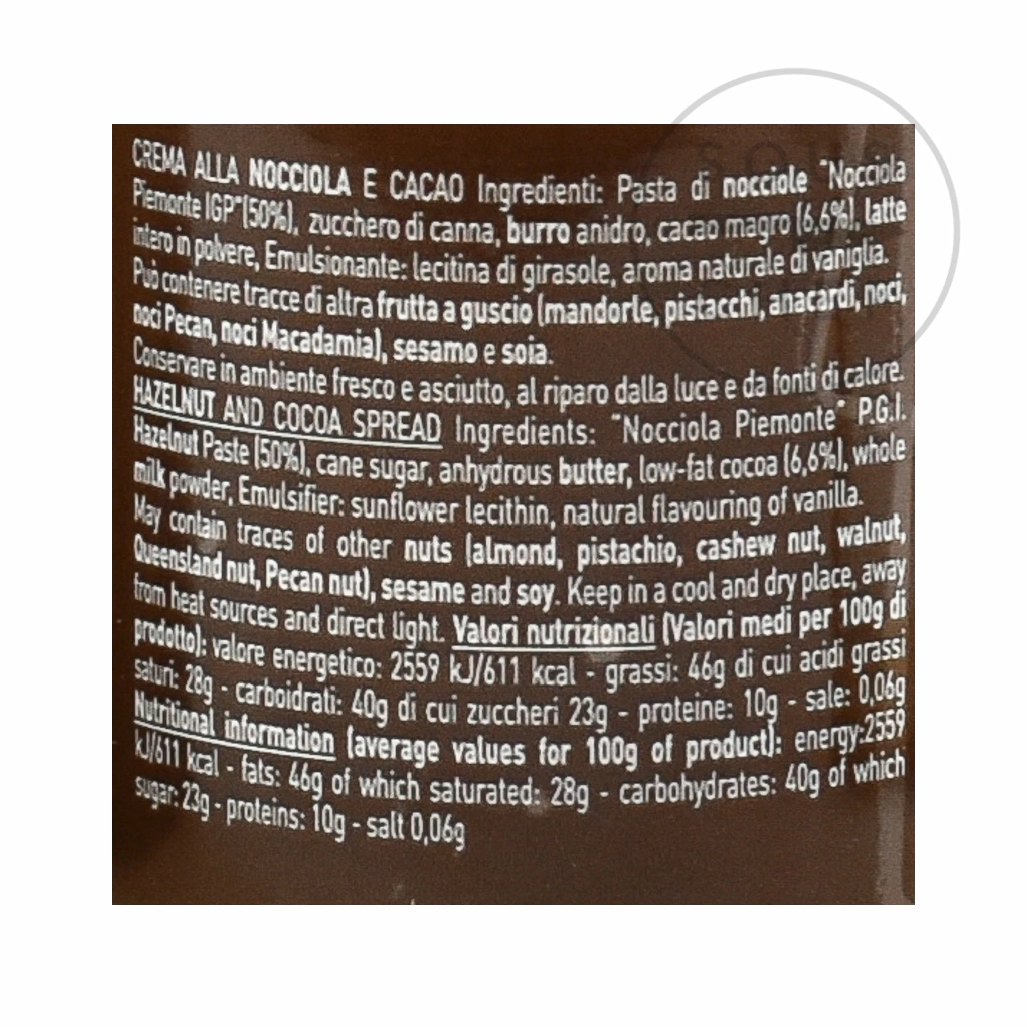 Ingredients: “Nocciola Piemonte IGP” hazelnut paste (50%), cane sugar, anhydrous butter, low fat cocoa (6.6%), whole milk powder, emulsifier: sunflower lecithin, natural flavouring of vanilla.