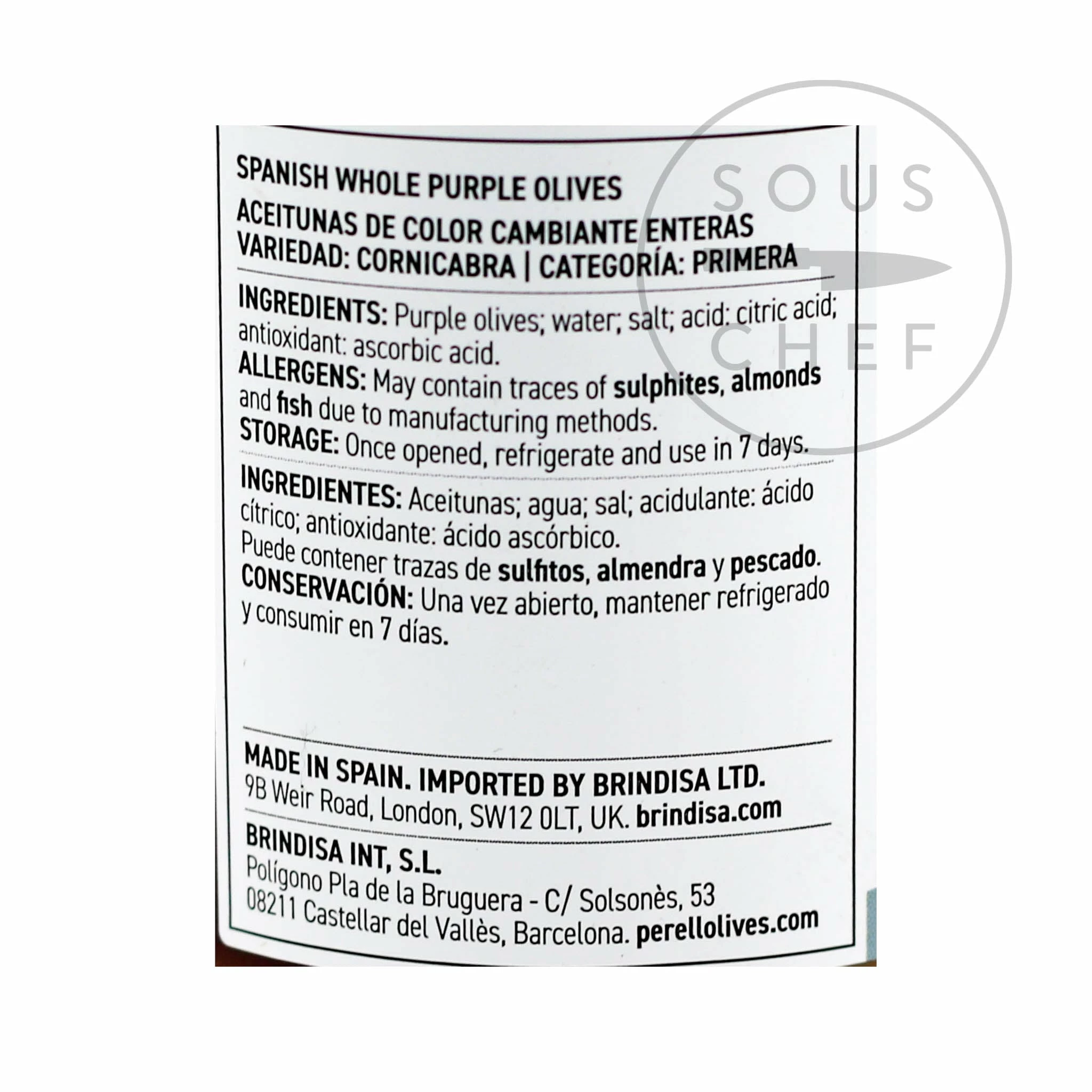 Ingredients: Purple olives; water; salt; acid: citric acid; antioxidant: ascorbic acid.