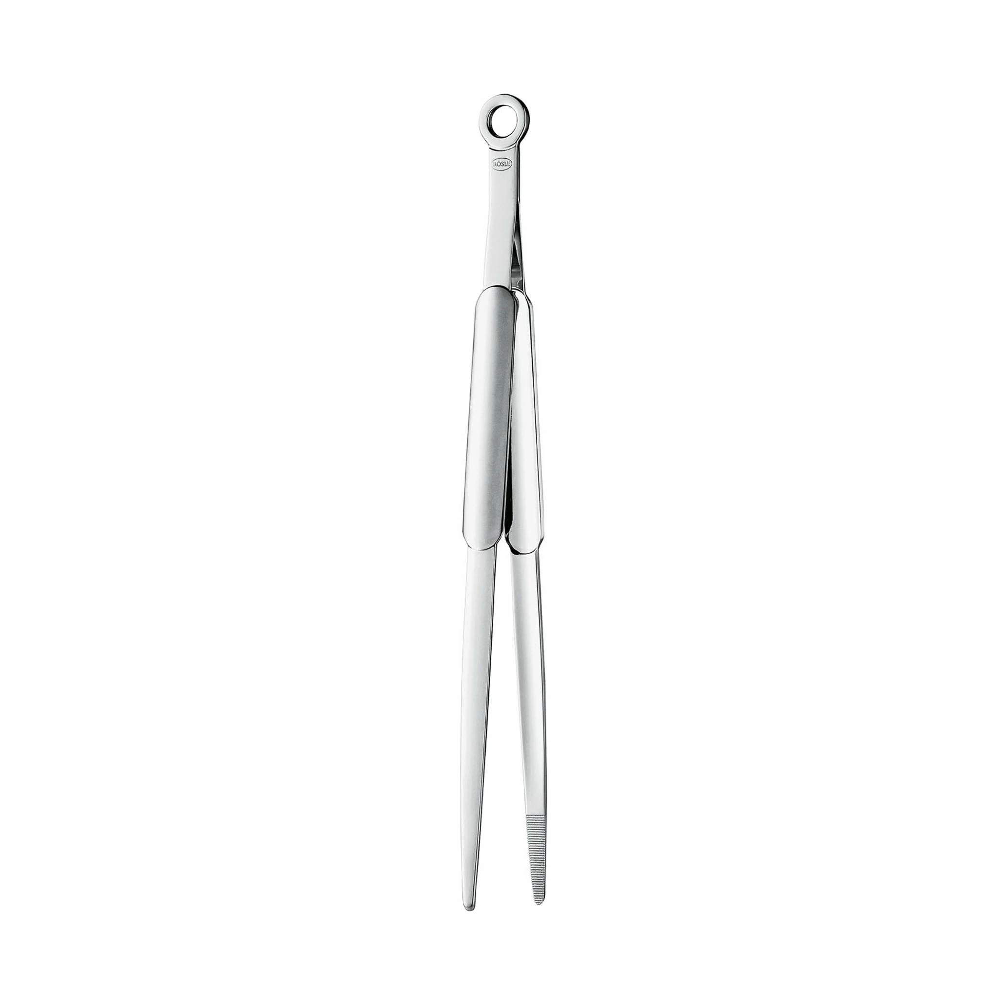 Rosle’s Modern Classics fine tongs are a useful kitchen utensil when preparing and cooking shellfish such as scallops, and other delicate ingredients. Made of stainless steel, the long tongs have slightly curved tips to lift ingredients without damaging them.Â
