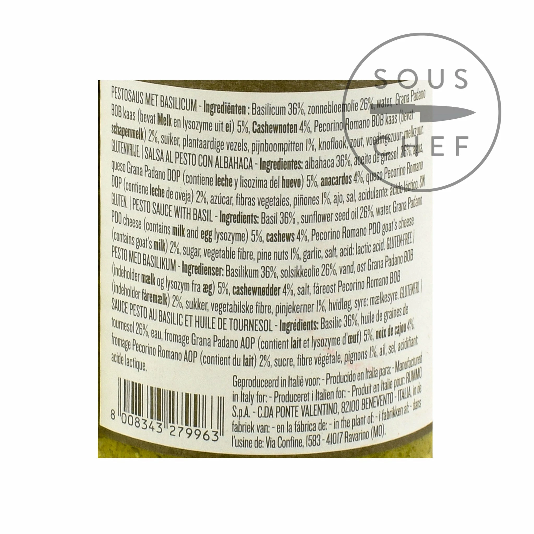 Ingredients: Italian Basil 32%, sunflower oil, potato flakes, glucose syrup, cashew nuts, Grana Padano Chesse (milk, salt, rennet, contains egg lysozyme) 5%, Pecorino Romano Cheese (ewe’s milk, salt, rennet) 4.5%, extra virgin olive oil 2%, pine nuts, salt, natural basil flavouring, garlic 0.3%, acidity regulator: E270, Antioxidant: E300. May contain other nuts and peanuts.