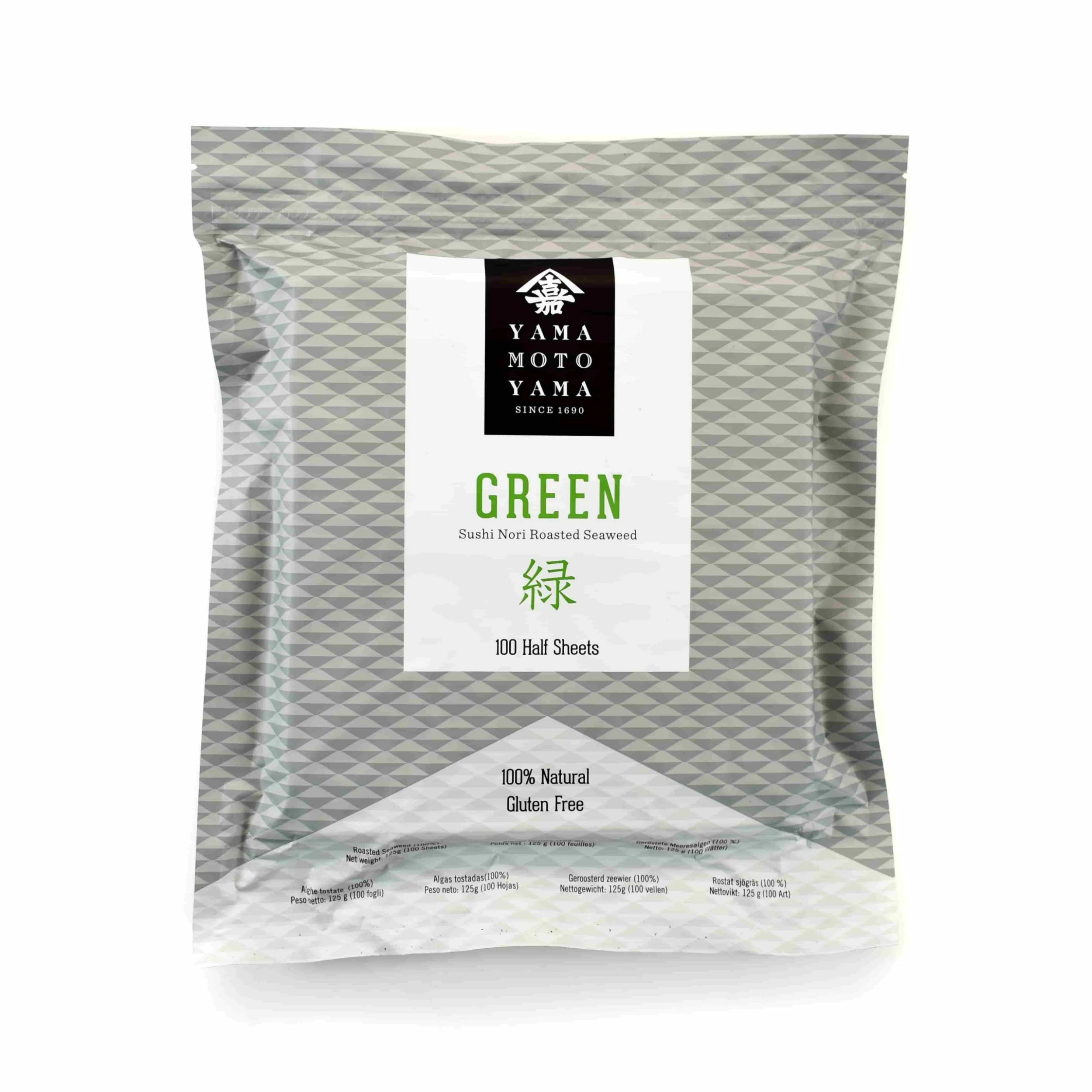 Use yakizushinori green half cut nori sheets for quick and easy sushi making. The sheets of roasted seaweed are pre-cut for convenience – simply take a sheet from the stack and place it straight on the bamboo mat ready for filling, or make a quick hand roll. The sheets of nori also have perforations that you can tear along to create long, thin strips. Use these as a garnish or in creative sushi rolls.