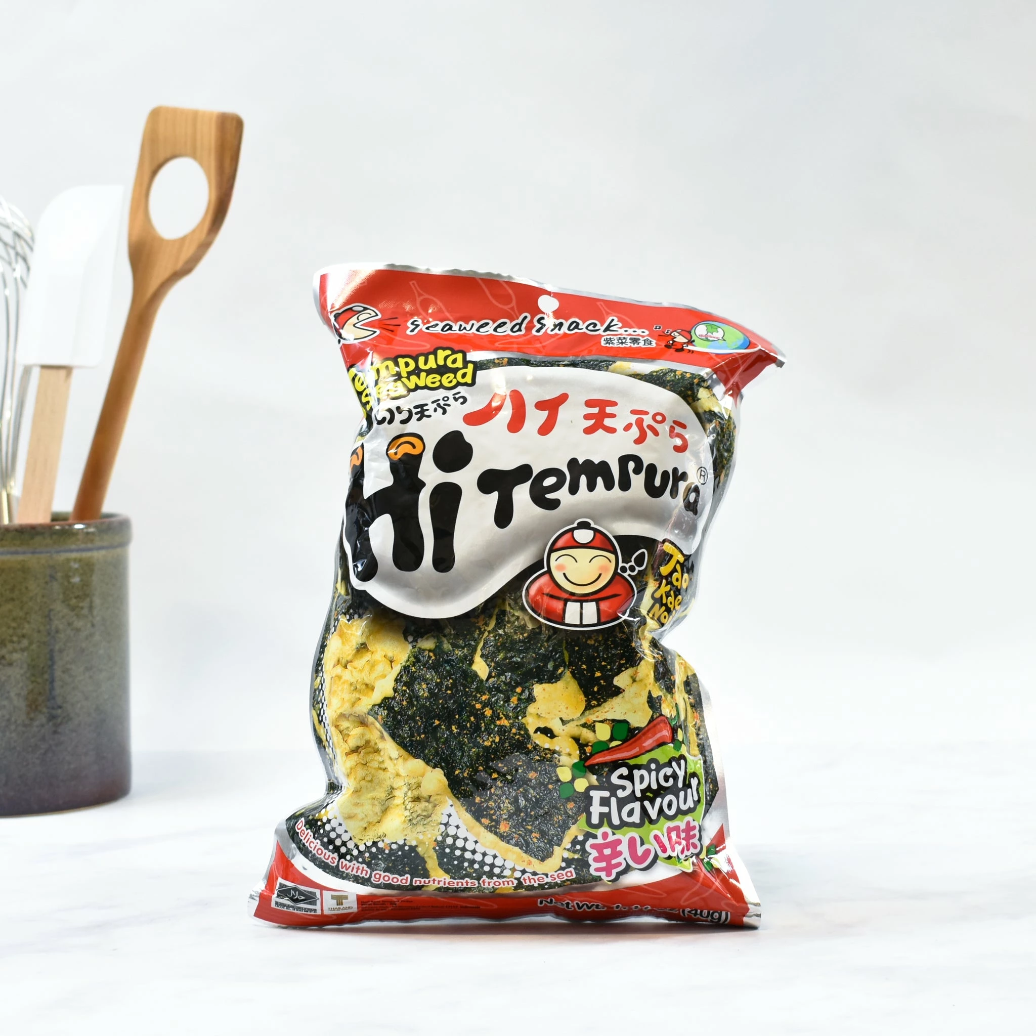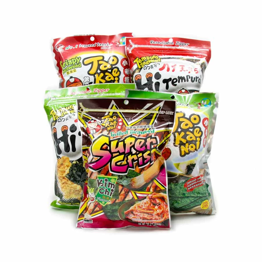 Tao Kae Noi tempura seaweed spicy is a lightly-salted, spicy snack consisting of crispy, fried strips of seaweed dusted with chilli powder. The Thai company Tao Kae Noi (or Taokaenoi) was only set up in 2004 but has quickly become one of the most respected brands of dried seaweed. Tao Kae Noi crispy tempura is made from high quality fresh seaweed which is carefully dried preserving its natural flavour.Â
