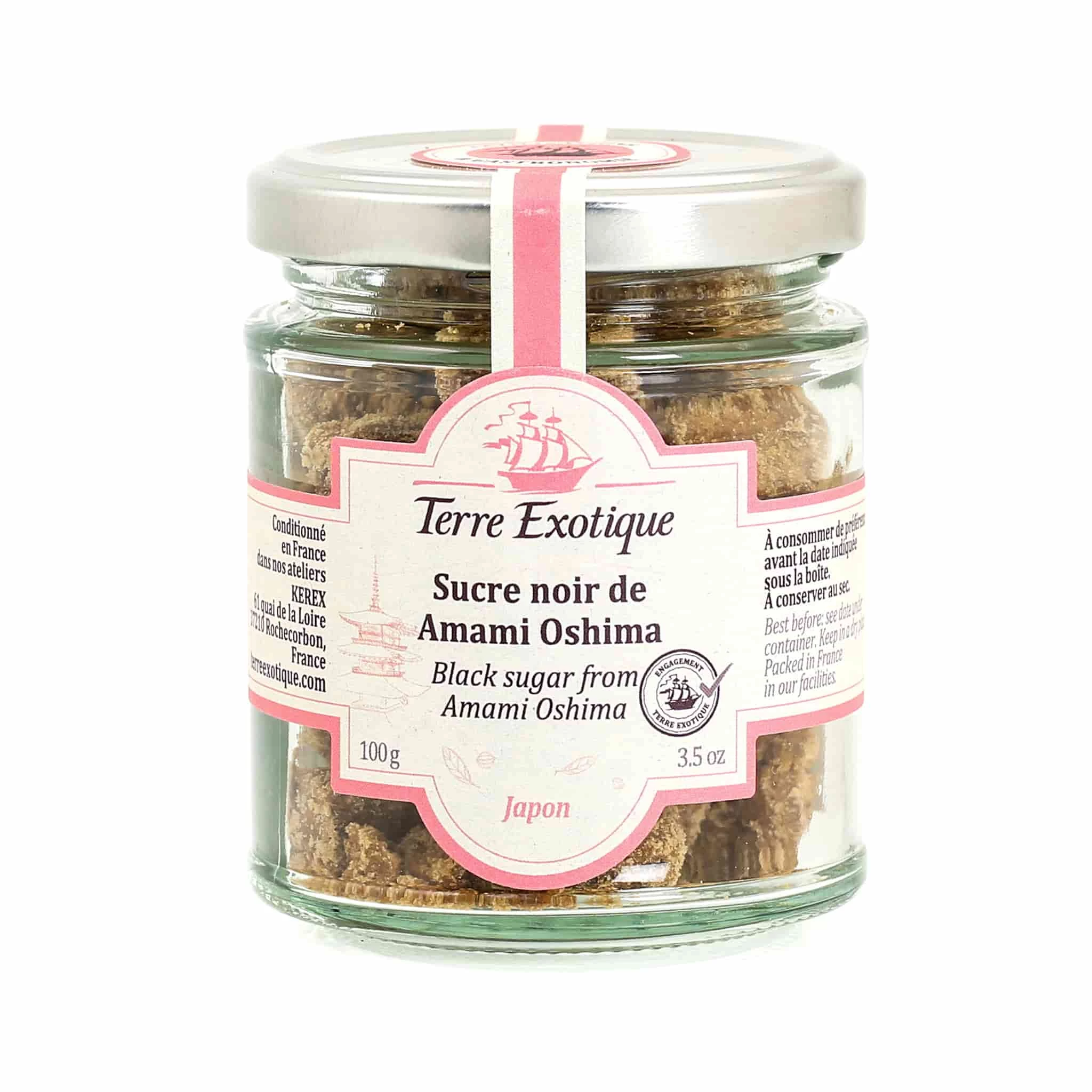 Terre Exotique’s Black Sugar From Amami Oshima is a Japanese sugar made from sugar cane. The cane is washed and rinsed, then cold pressed to extract the juice. This juice is then slowly reduced over a wood fire for 5 days – with nothing else added – until it caramelises, then crystallizes into dark nuggets.Â