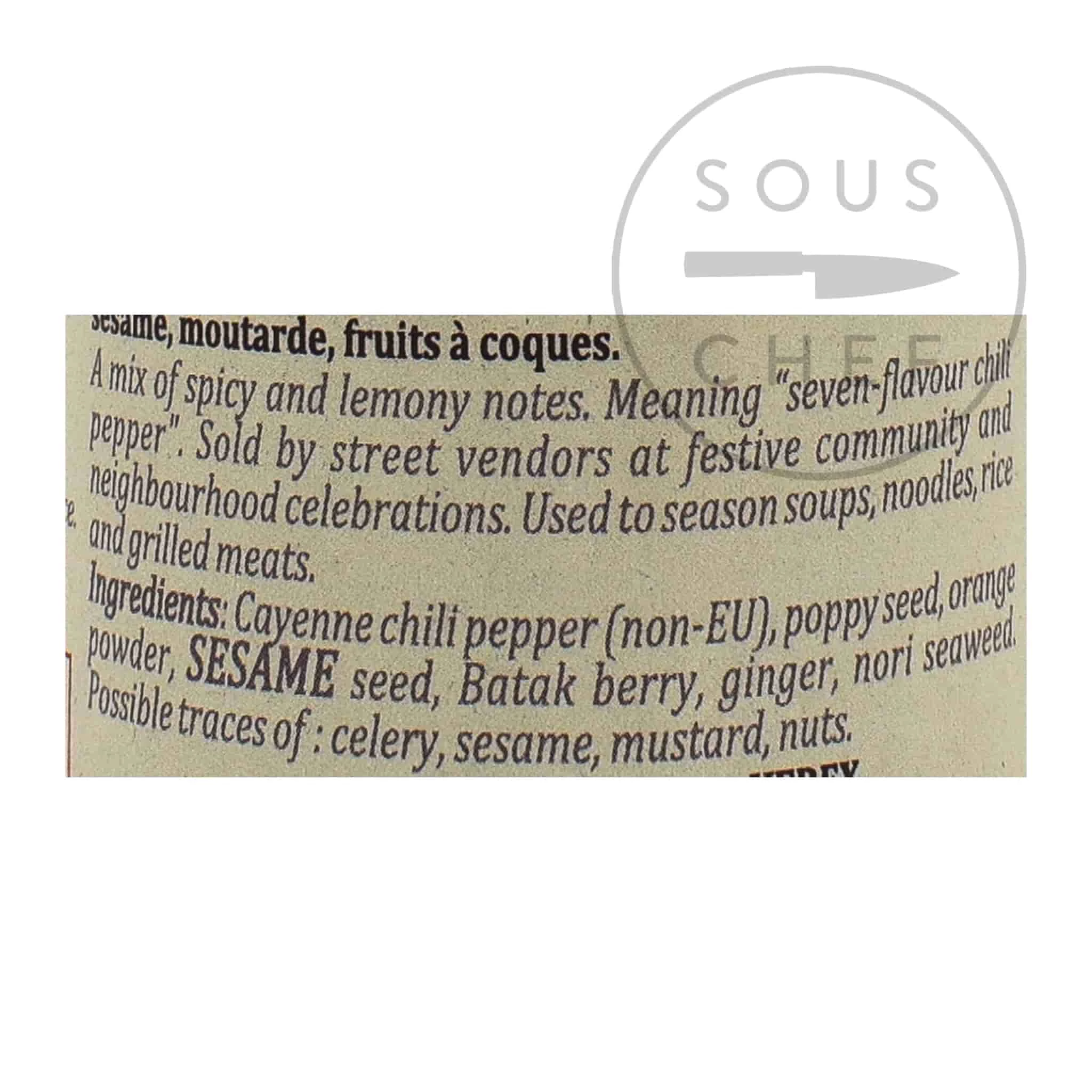 Ingredients: Cayenne chili pepper, poppy seeds, orange powder, sesame seed, Batak berry, ginger, nori seaweed.