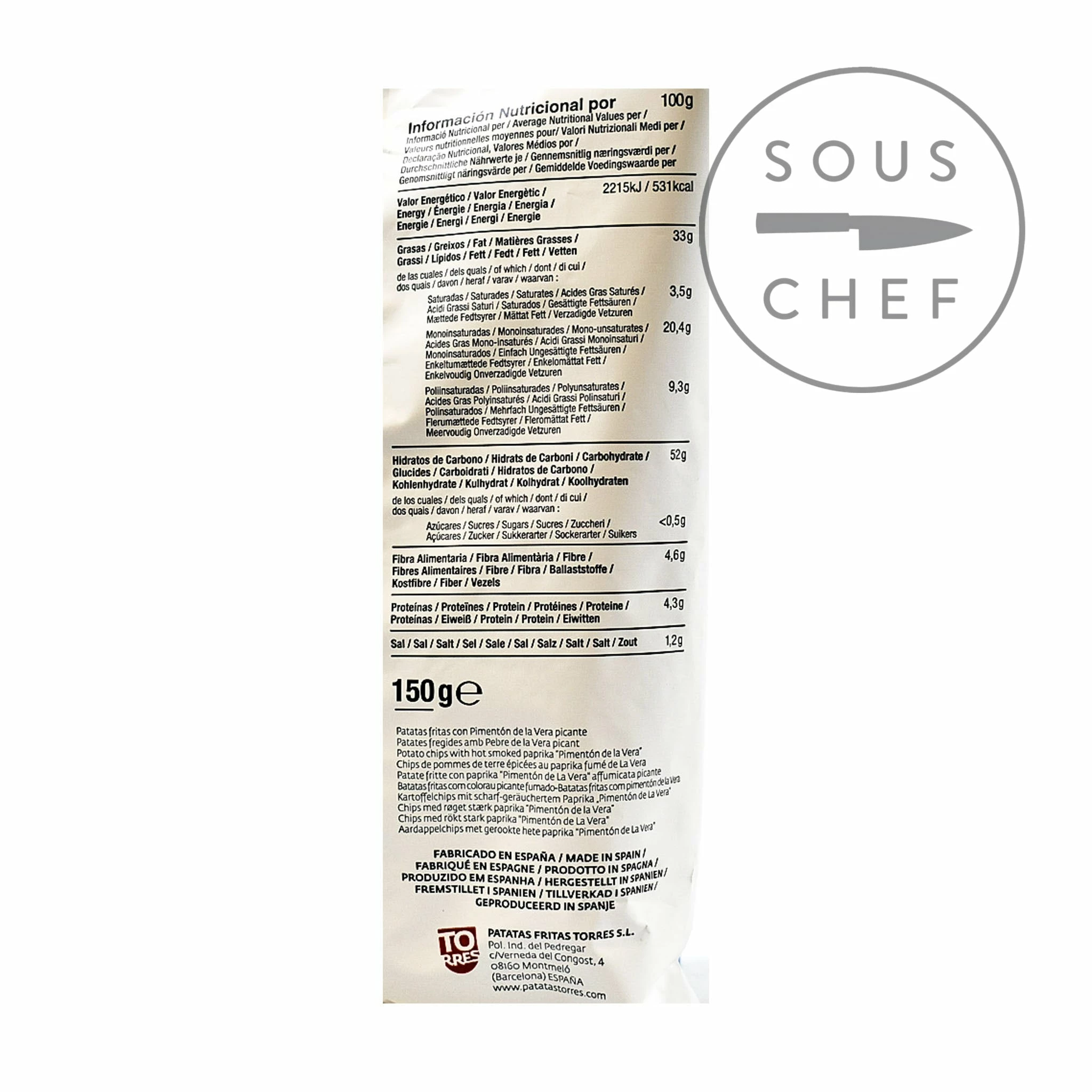 Ingredients: potatoes, sunflower oil, De la Vera DOP hot smoked paprika (0.6%), salt.