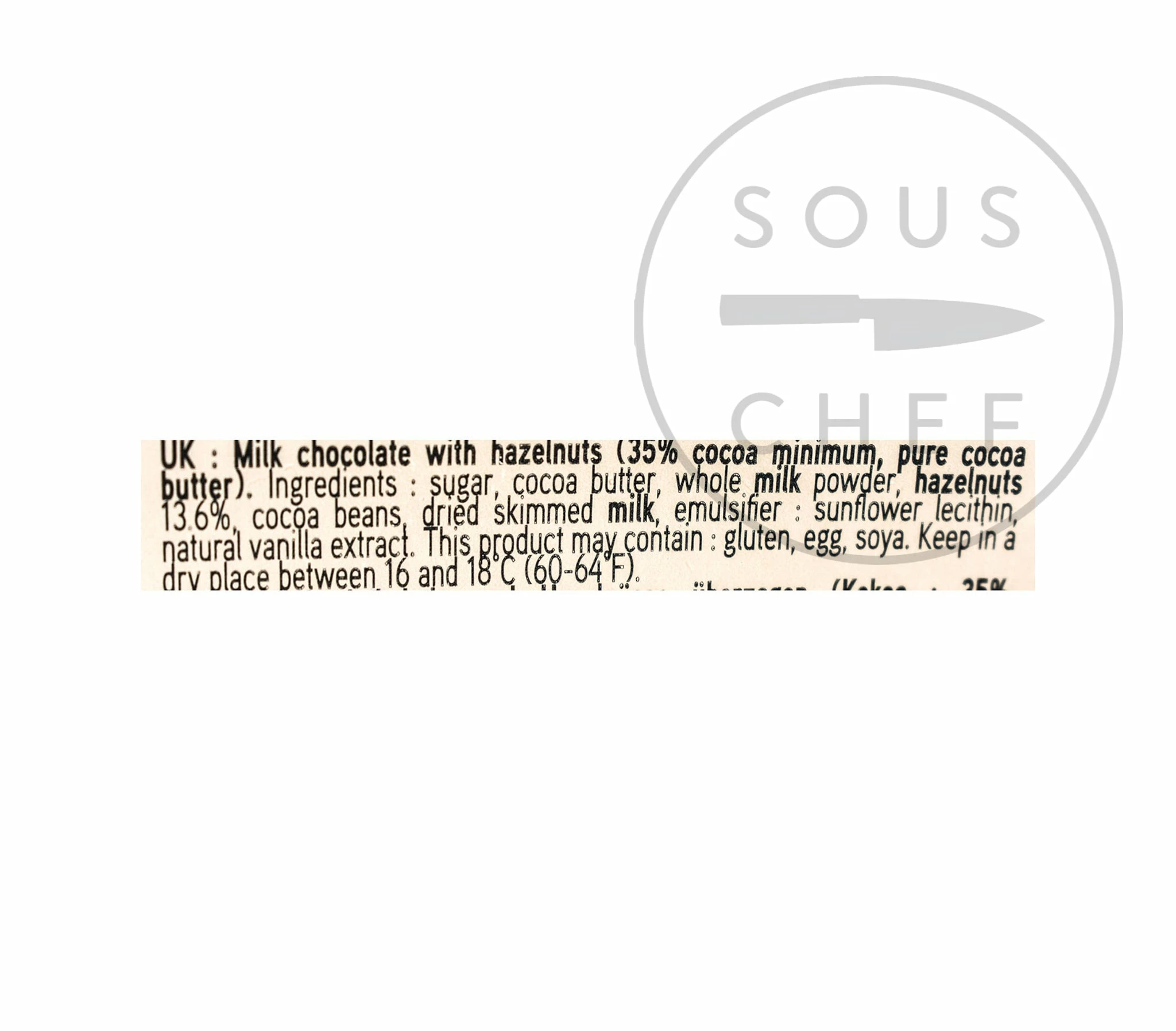 Ingredients: Sugar, cocoa butter, whole milk powder, hazelnuts 13.6%, cocoa beans, dried skimmed milk, emulsifier: sunflower lecithin, natural vanilla extract.Â