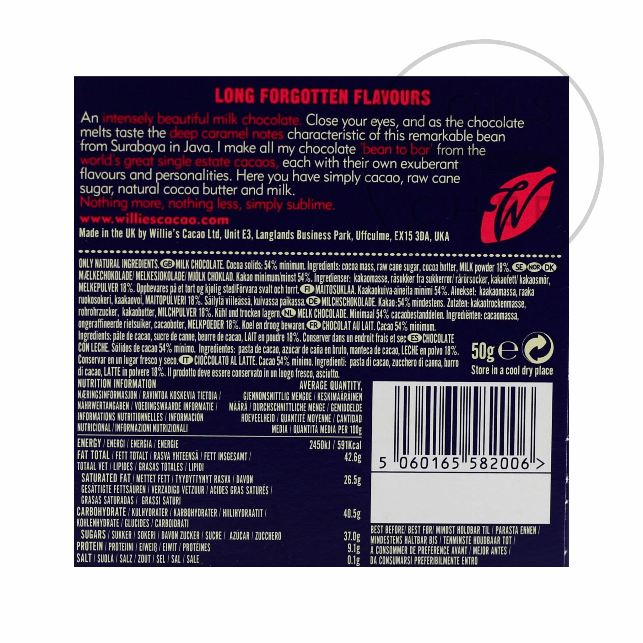 All Willie’s Cacao chocolate is made ‘from bean to bar’. Unique characteristics of different cacao varieties (sourced from around the world) are brought to the fore – some might naturally taste of nuts, others of summer fruits. Willie’s Cacao chocolate contains only cacao, raw cane sugar and natural cocoa butter – no vanilla or soya lecithin – and is made in small batches in Devon.