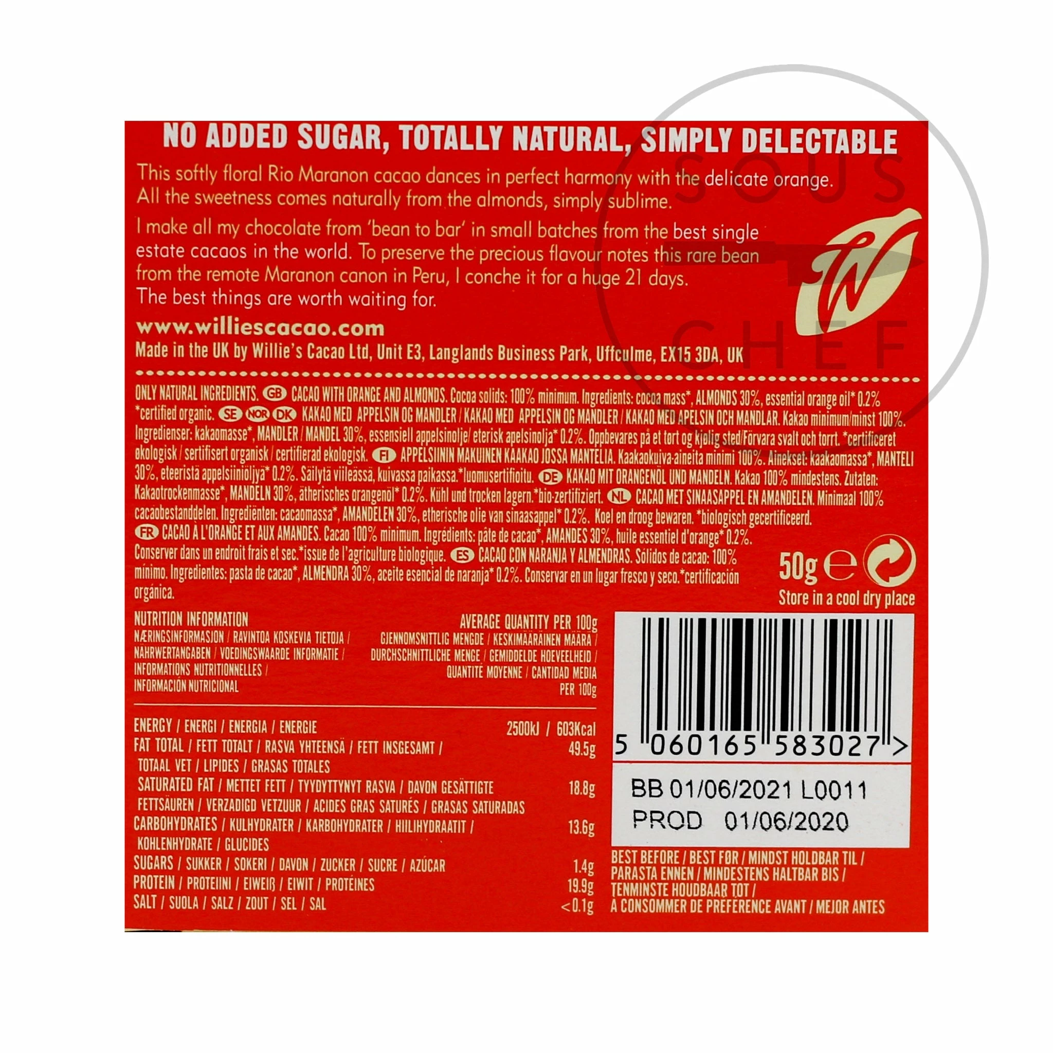 Ingredients: Cocoa mass*, almonds 30%, essential orange oil* 0.2%. *certified organic