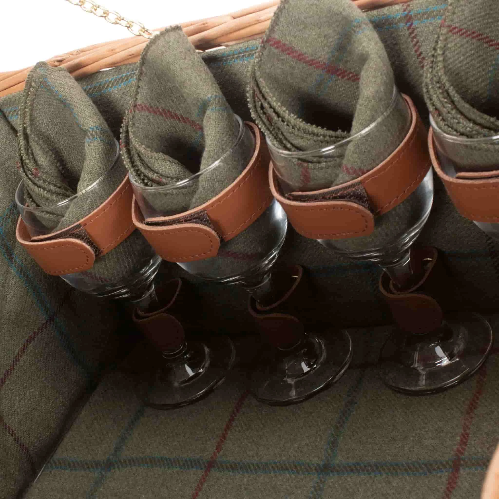The tweed picnic hamper for four comes with everything you need for a luxurious picnic – just add the food! This traditional, countryside-style willow hamper has tan leather straps and a dark green tweed lining – it’s ideal for feasts in the park or long lunches by the coast. Plus, the side handle makes this hamper easy to carry, whether you’re travelling by car, train or on foot.